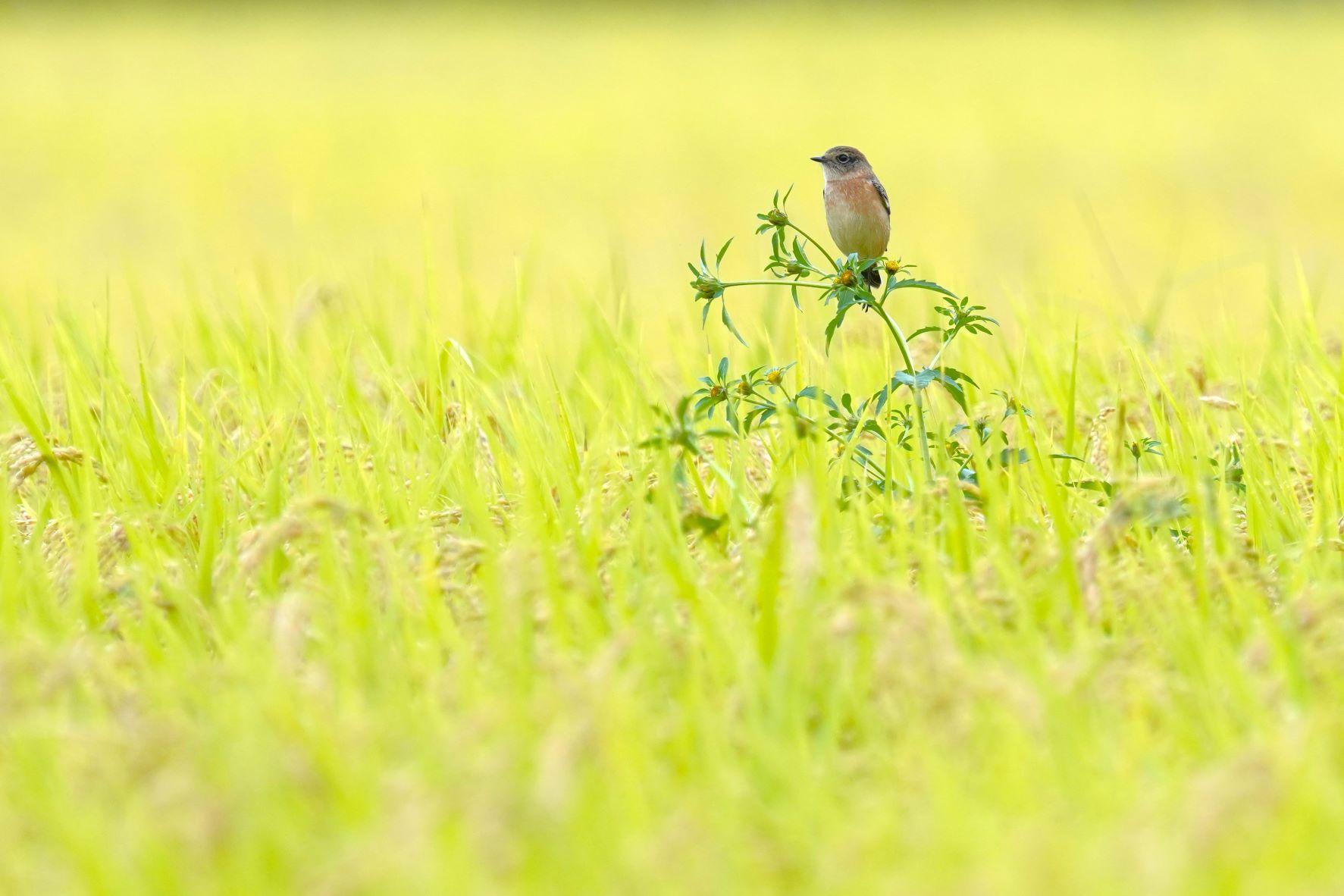 渡りの時季になりあちこちにノビタキの姿が見られます。今秋もソバノビを狙い蕎麦畑に出掛けてみましたが、中々蕎麦の花にとまってくれません。場所を移動し田圃に行ってみると数羽のノビタキが黄金色の稲穂の上を飛び交っていましたので、とまってくれるのを待ち何枚か撮影してみました。