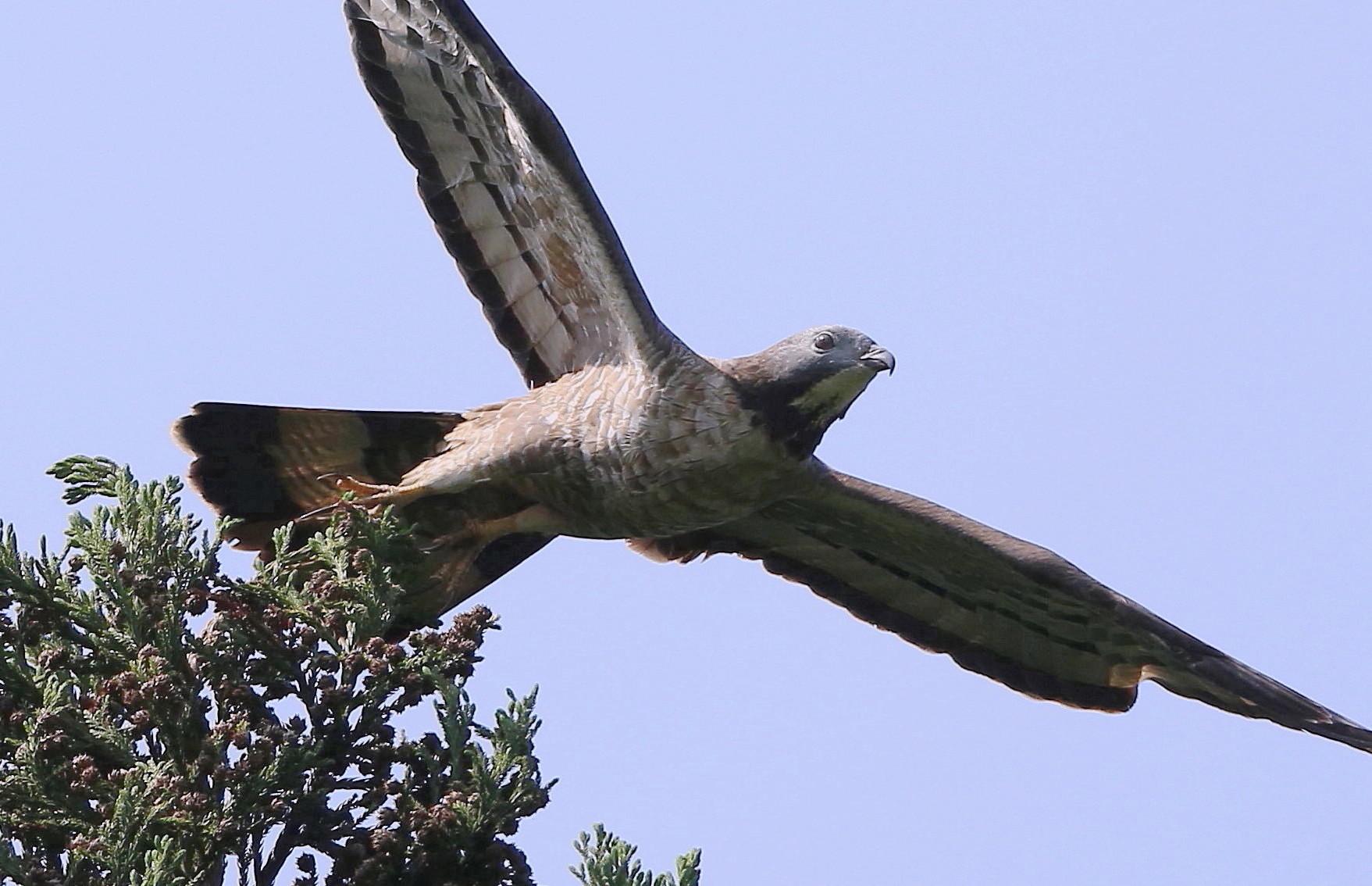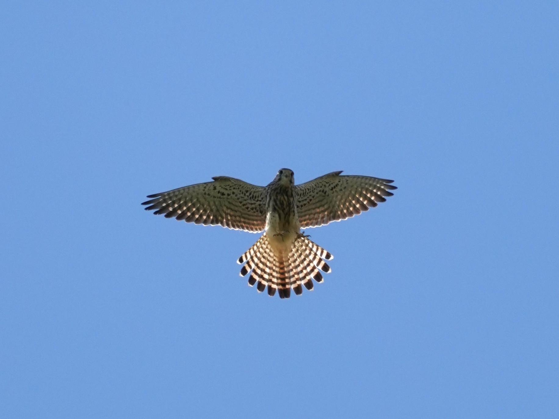 秋晴れで抜けるような青空、まだ暑いですが気持ちの良い日です。乗附緑地探鳥会では特筆すべき鳥も出ず少々残念な結果でした。空を見上げると遥か頭上高くチョウゲンボウがホバリングしていました。地上のネズミかバッタでも見つけていたのでしょうか? 真上にいて目が合ってしまいました。(合ったような気がしました。笑) 遠いので強トリミングしました。