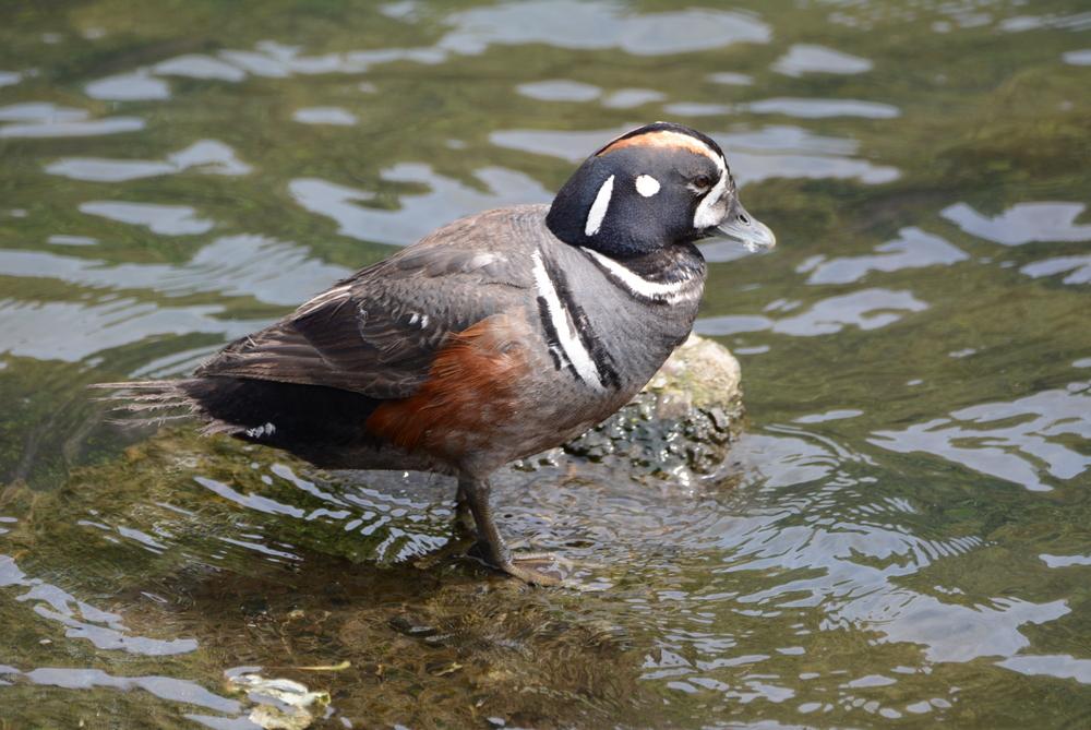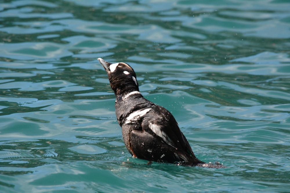 海上のシノリガモ、尾羽が跳ね上がっている。