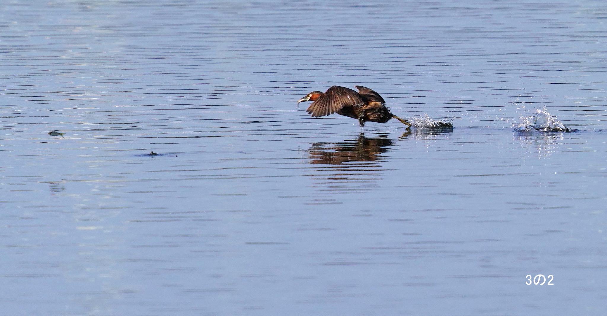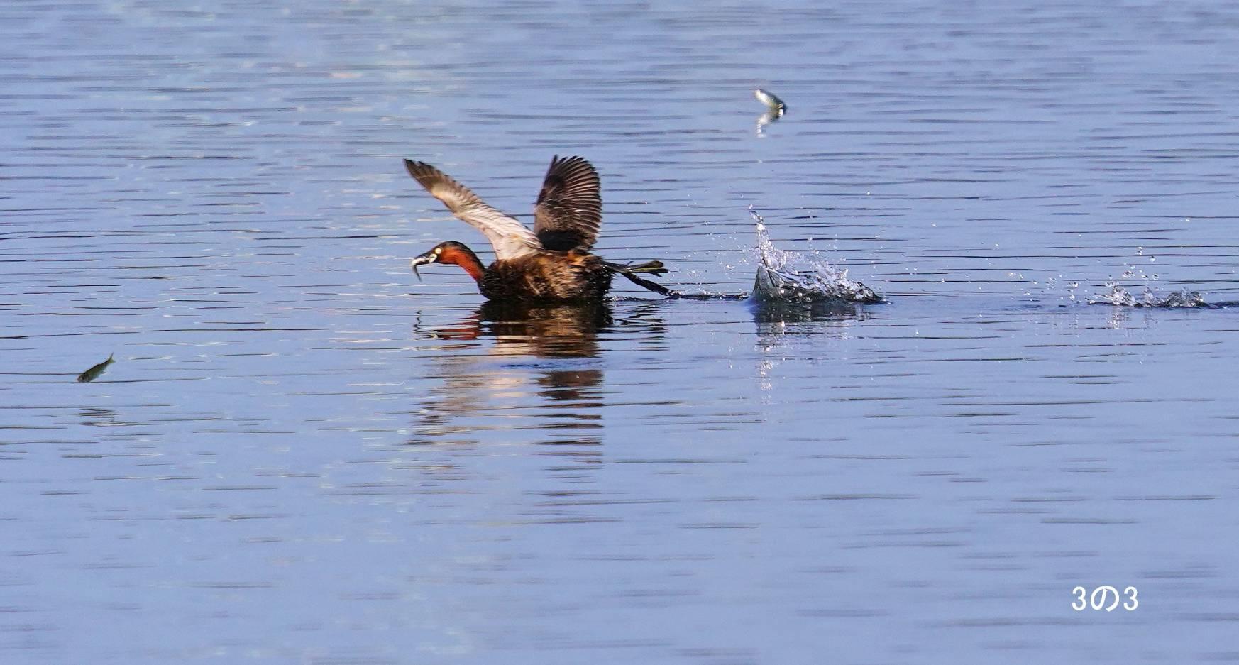 九十九川と碓氷川の合流地点で板鼻堰の広い川面では、通常ではちらほらですが稀に環境条件が整うと広範囲に多くの川魚が意を合したかのように、一時「約30分間ほど」一斉に川面上に跳ね上がることがあるようです。時は7月下旬日の7時前、川魚が広範囲に密な状態で多くの川魚が川面上に跳ね上がる初めての光景に遭遇。最初は5分間程見とれてましたが左岸を見るとカイツブリが川辺の草むらを出入りしてるのを確認し胸中が騒ぐ。急遽して機材を三脚でセットアップし、レンズを左岸縁に向けて間もなく:いきなり:カイツブリが川面中央に向かい水面を高速で走り出し何とか途中からでもレンズを追随、ワンタッチ3枚連写での投稿画像です。それにしてもカイツブリさん通常は水中での名ハンターなのに、水面上でも狙った獲物は逃さない俊敏な業に感服しました。