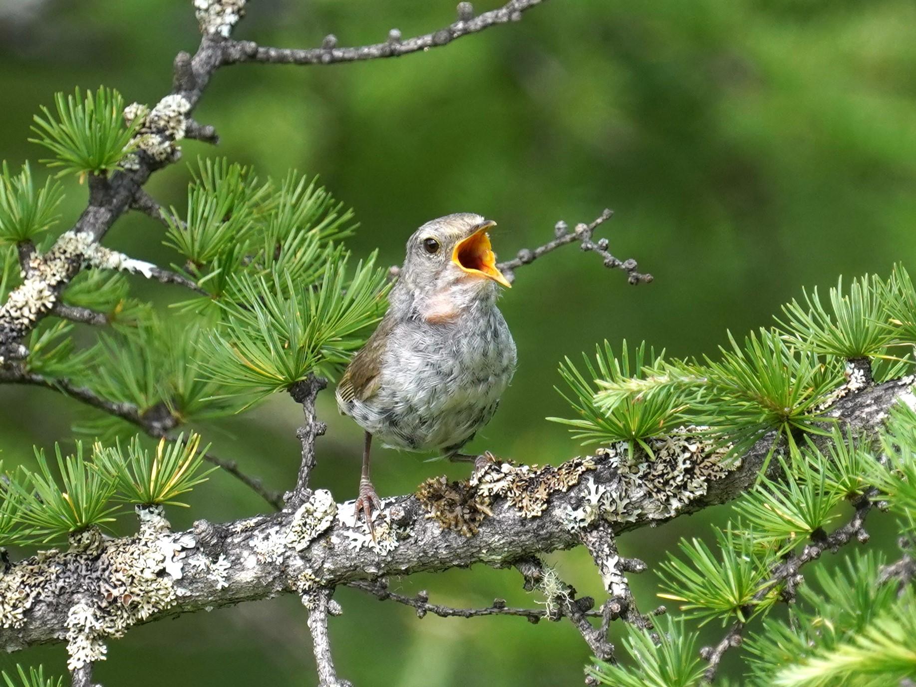 幼鳥も囀ることがあるかもしれません。ただ、梢で囀ることは天敵に狙われる危険が伴います。成鳥であれば、縄張り維持やメスへのアピールがあるので、危険を冒してでも囀るメリットがありますが、幼鳥ではどうでしょうか。 無機質な、つまらない考え方で、すみません。