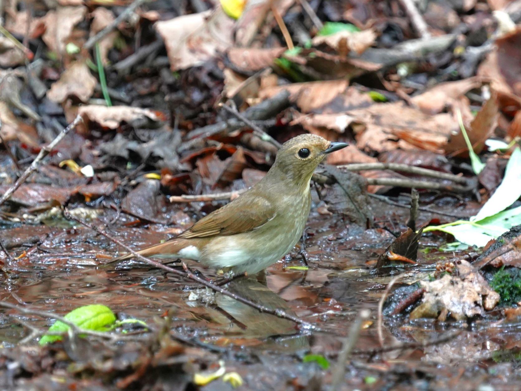 山の薄暗い水場にオオルリが水浴びに来ました。女子ですね。