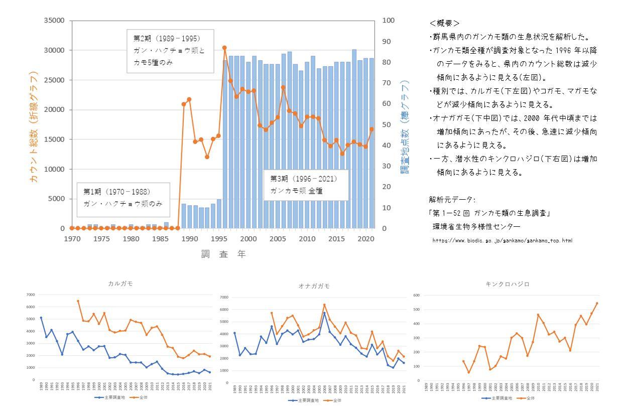 群馬県鳥類目録改訂第三版の作業中です。今回は初版(2012年版)の資料編も改訂予定です。本会も協力している環境省のガンカモ調査の結果を元に、県内のガンカモ類の個体数の推移をまとめています。まだ、単純に個体数をグラフにしただけで統計解析はしていませんが、カルガモ(越冬数)がこんなに減っているとは思いませんでした。
