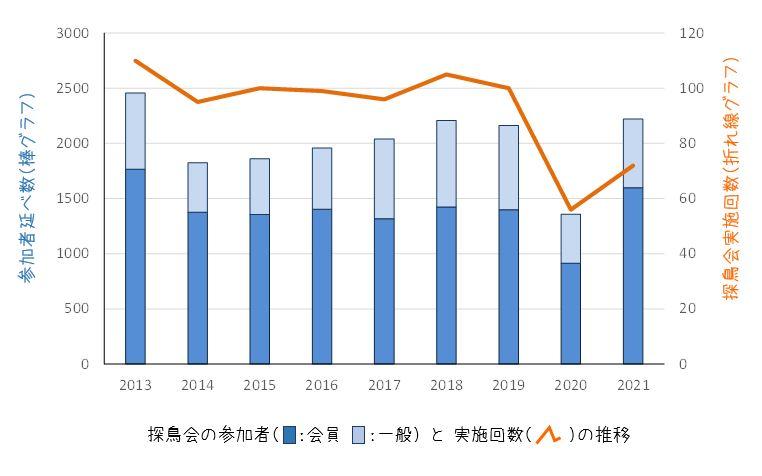 2013-2021年の探鳥会の記録種データをもらっていたので、目録用に変換しました。鳥の記録をまとめる手始めに、探鳥会についても少しまとめてみました。最近は、コロナ禍で中止になった探鳥会も多かったですが、それでも「外で鳥を見る」のは癒しになるのだなぁ、と結果から改めて実感できました。この9年間に71カ所(県外含む)の探鳥地で、延べ833回の探鳥会が実施され、会員12,554名、未会員5,534名、合計18,088名の参加がありました。238種が記録され、このうち県内の記録は192種でした。この記録も、県内の鳥の動向を知るための重要なデータとなります。探鳥会に参加されたみなさん、そして探鳥会を企画・運営された幹事や役員のみなさんに感謝です! もちろん姿を見せてくれた鳥たちや周りの環境、なにより探鳥会を実施できる平和な日常にも感謝!!