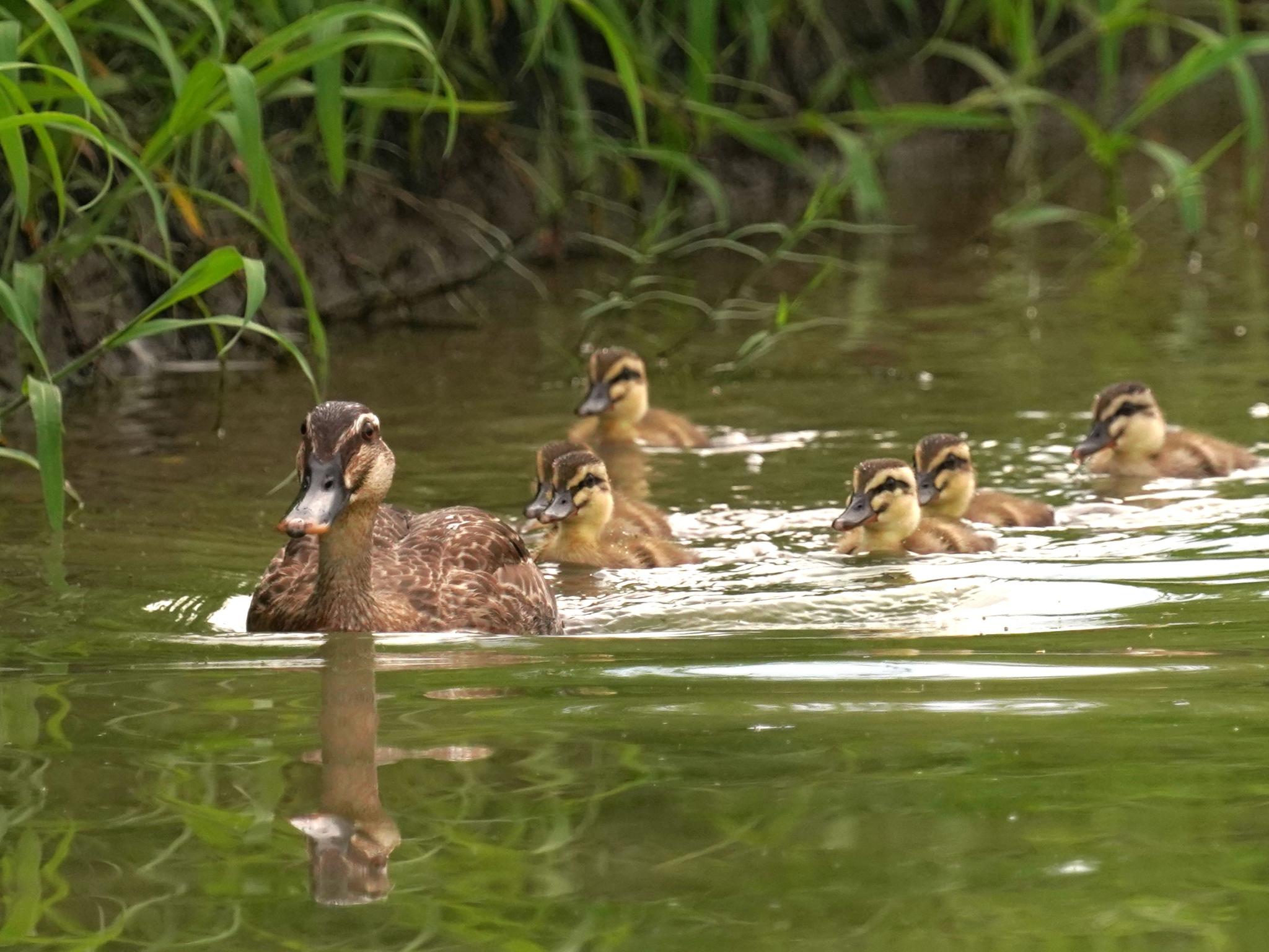 白いカラスを撮影しに出かけましたが残念ながら会えなくて、帰ろうと思ったら目の前の田んぼ(休耕田)をカルガモの親子が泳いで来ました。子供の数は6羽、ラッキーな気分でした。