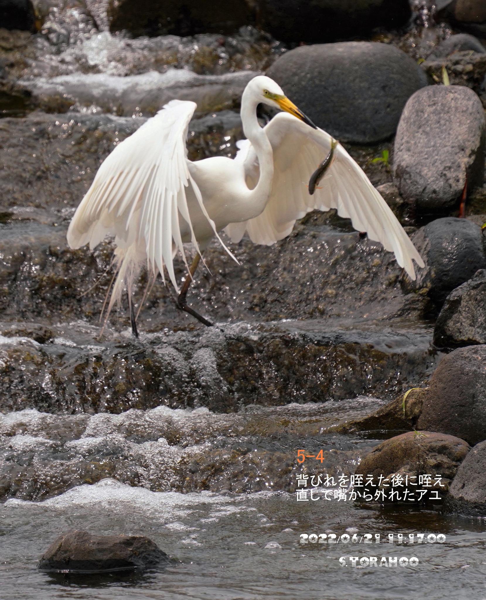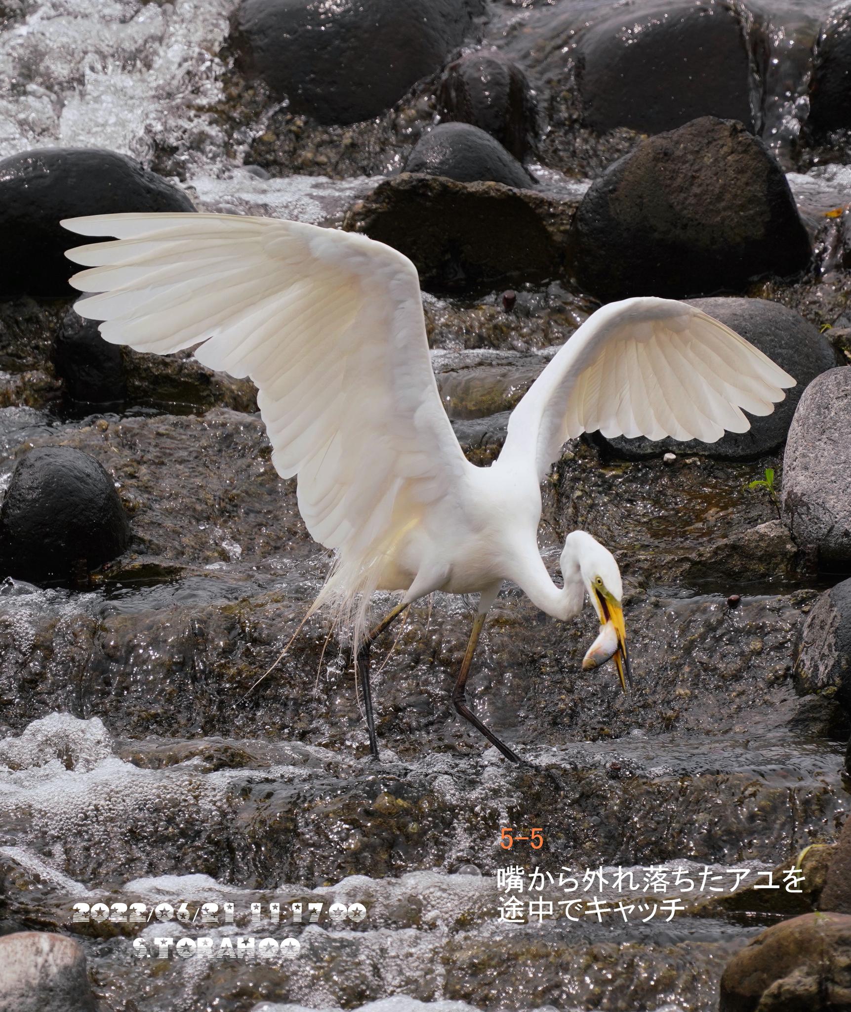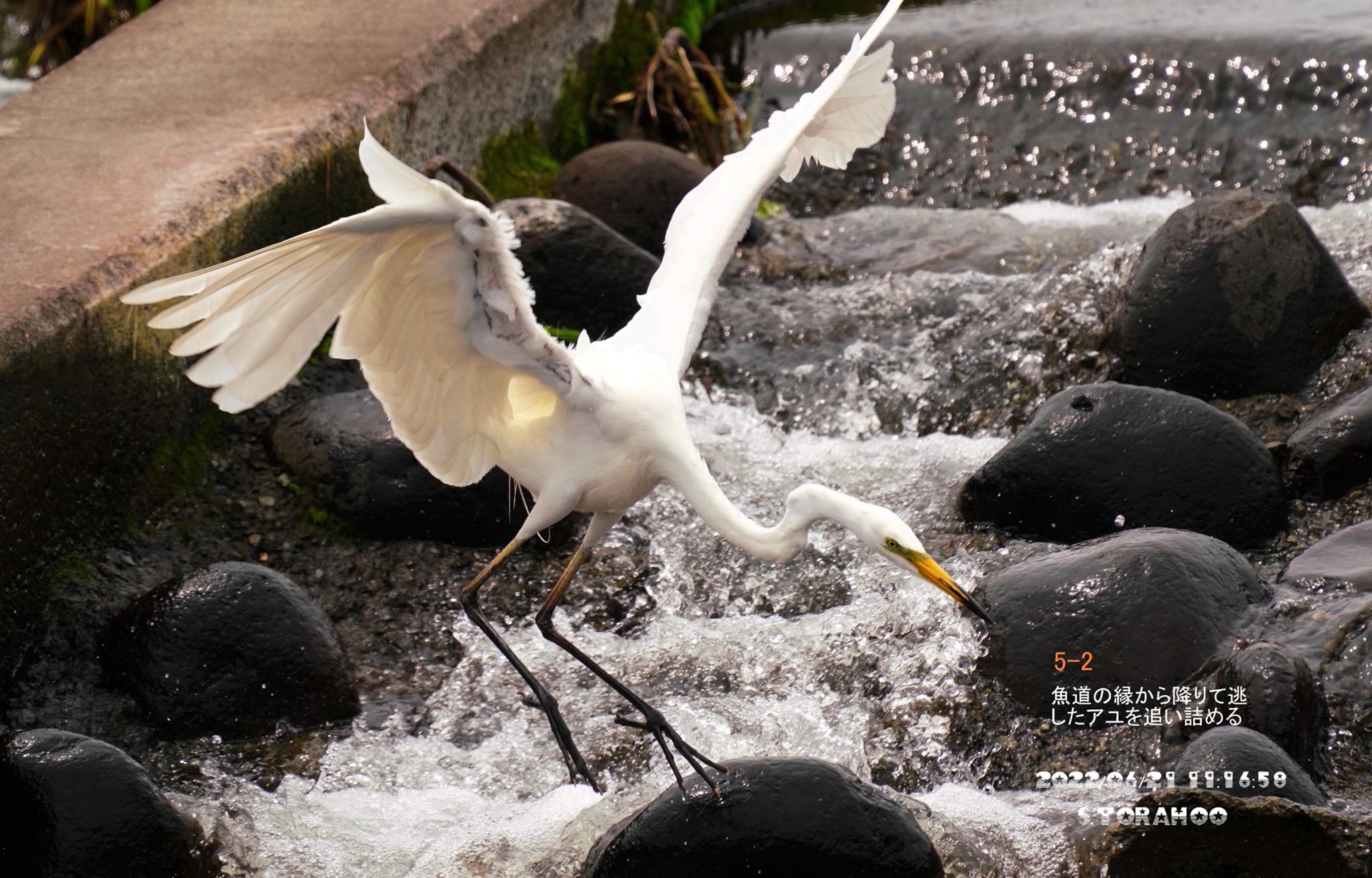 六月に入り碓氷川にも海からの天然アユが盛んに溯上するこの時期、ここ地元安中市の板鼻堰の魚道を溯上するアユを狙うダイサギが捕食する場面を捉えた(取り逃がす)画像です。