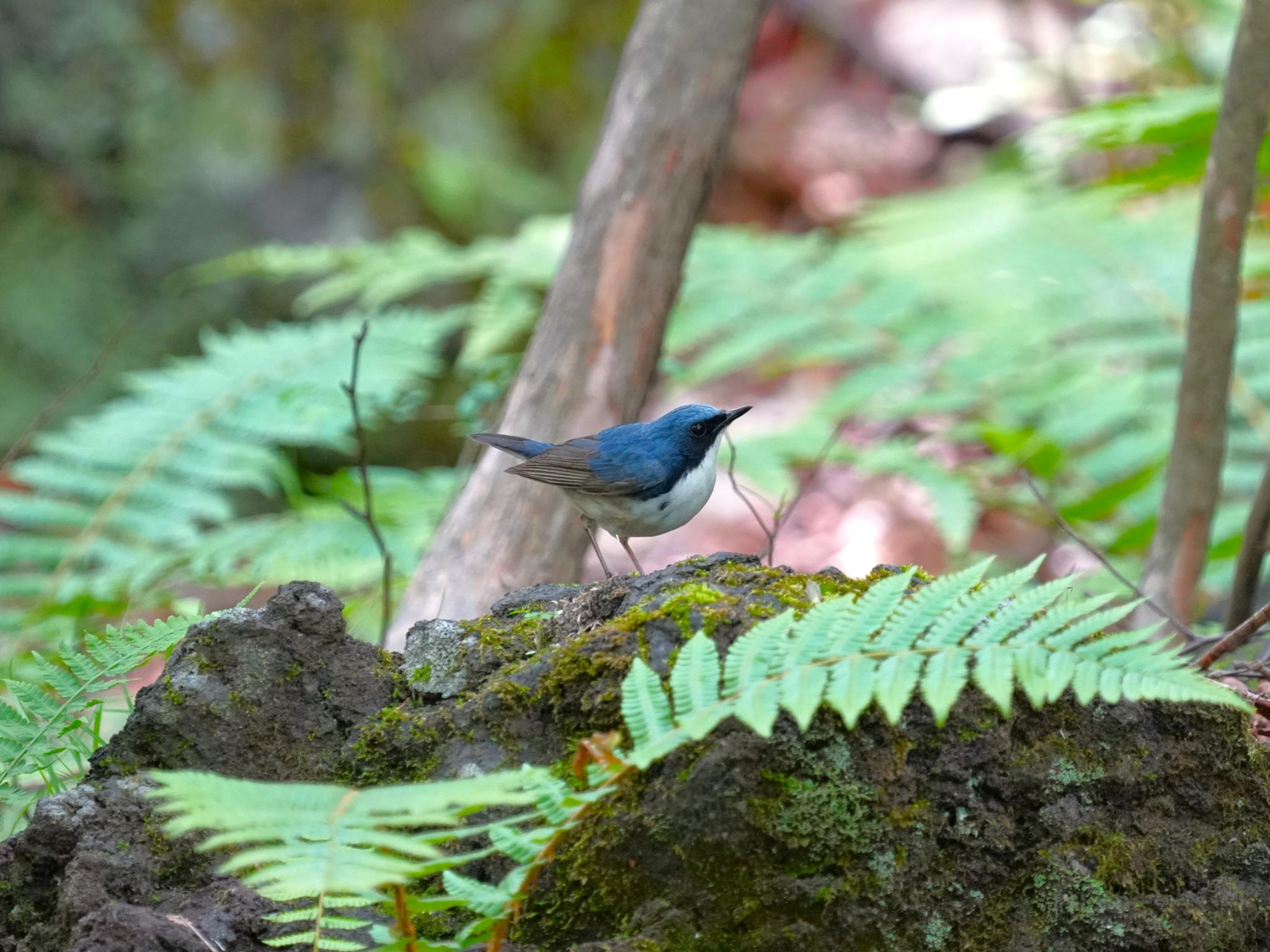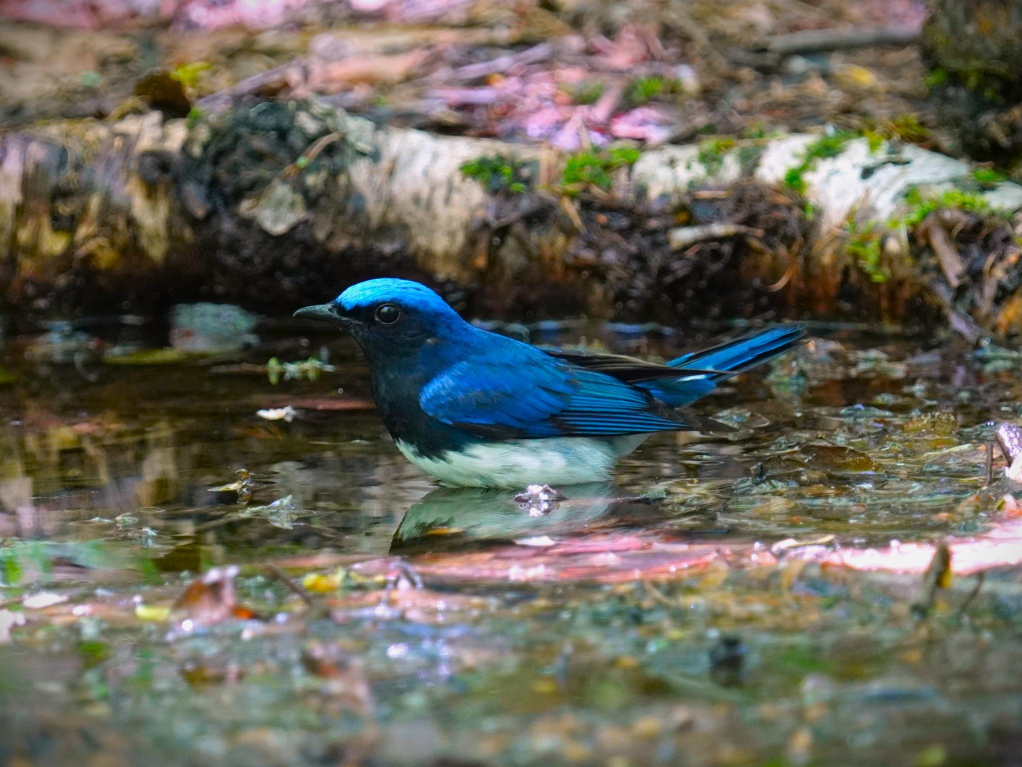 森の暗い水場にオオルリが水浴びに現れました。変に直射日光が当たらない方が羽色は美しく出ますが、いかんせん暗くてISO上げで繊細さを欠き、更にSスピードが極遅、カメラブレ被写体ブレばかりでした。
