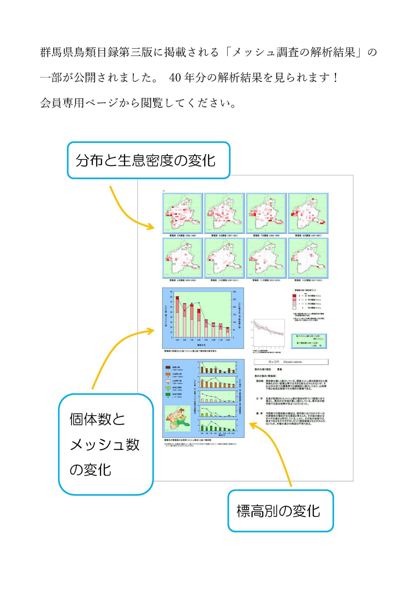 資料編の「メッシュ調査からみた群馬県の鳥類の分布と繁殖期の動向」の第一弾として非スズメ目32種がアップされました。40年にわたるメッシュ調査の結果から、繁殖期の分布とその動向、個体数と記録メッシュ数の変化、標高別の変化をまとめたものです。ホーム画面から会員限定ページに入り、ご覧ください。