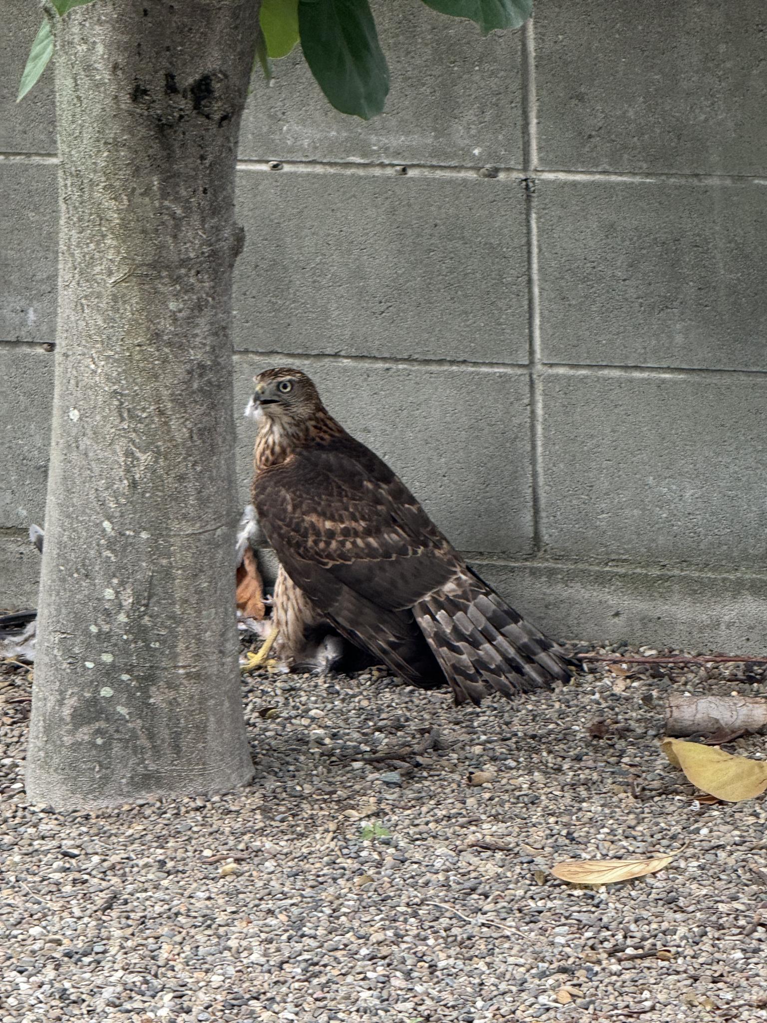 ご投稿ありがとうございます。まず食べられていた鳥ですが、残された羽毛からキジバトであることがわかります。次にこのタカですが、オオタカの今年生まれの幼鳥です。独り立ちし、ご自宅の近所で捕ったあろう獲物で、この日は十分にお腹を満たせたことでしょう。ご自宅の庭先で、このような光景を目にできるのはとても希なことで、タカも含めて鳥全般が好きな私としては、羨ましい限りです。