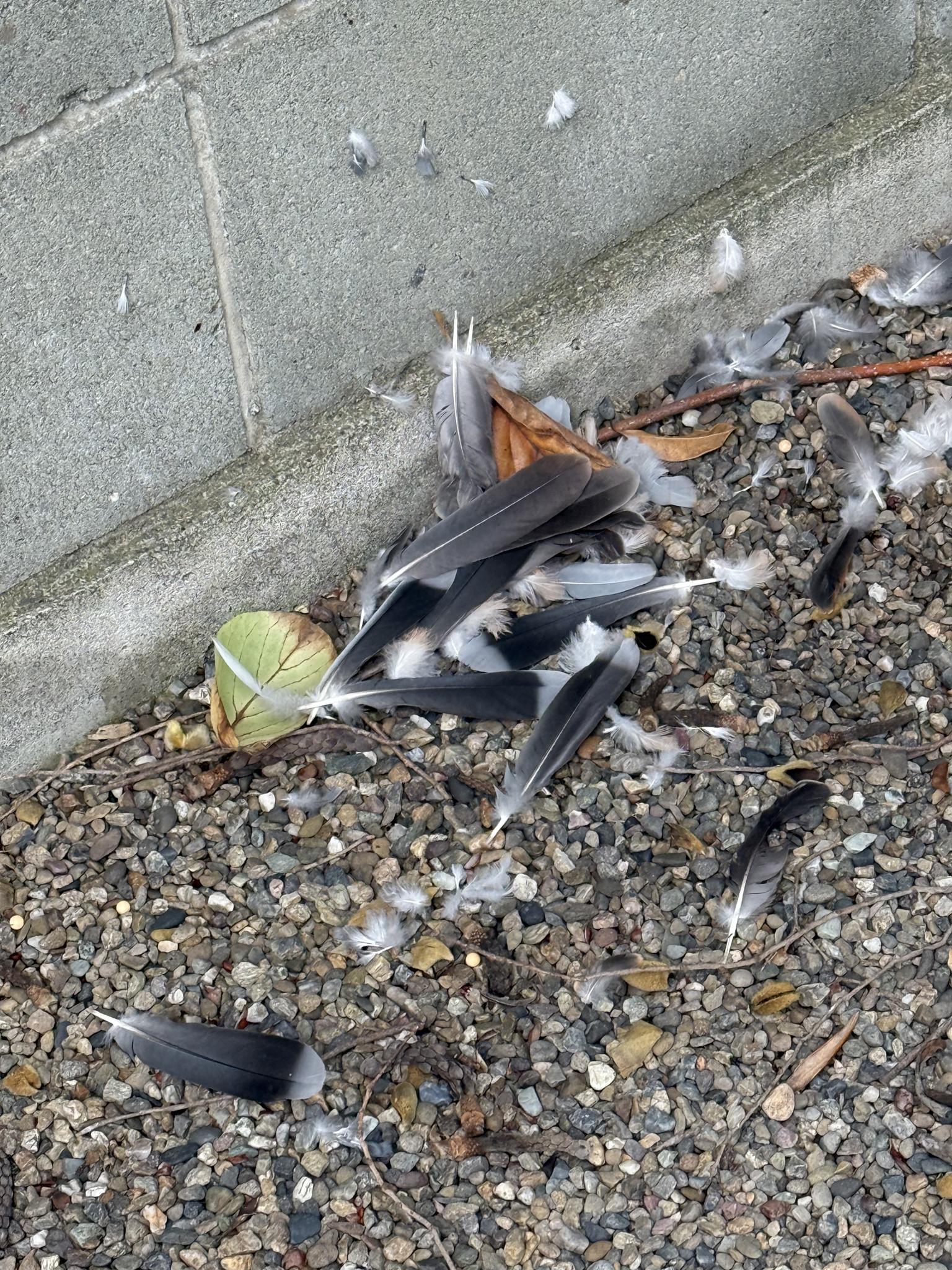 写真の足元に捕まえられてしまった鳥が確認できると思うのですが、雛ではなく顔の黒さや抜け落ちた毛からオナガの大人の個体でもなさそうで気になっています。