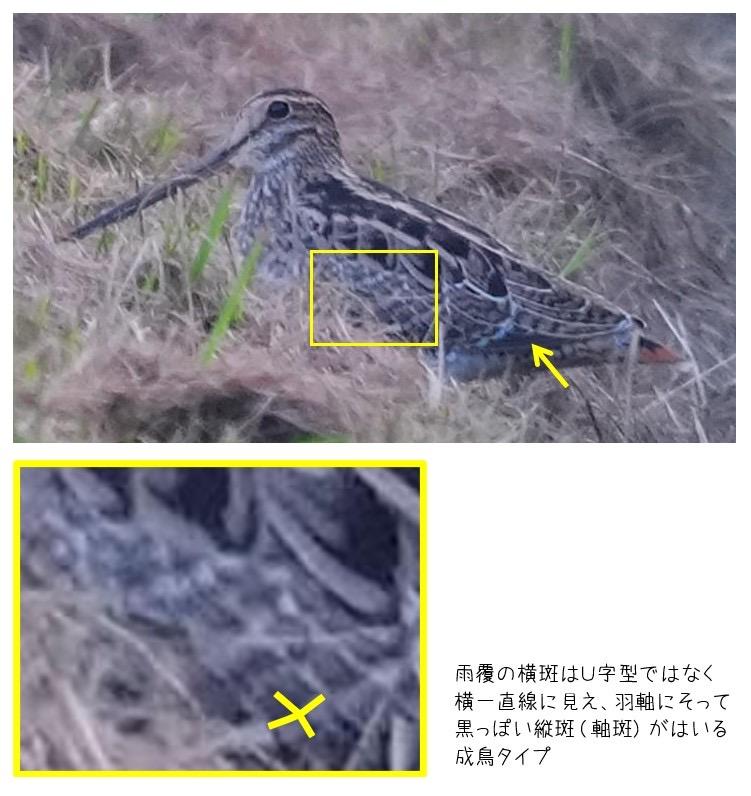 さて、ジシギは全く自信がありませんが、わかることをお知らせして、皆さんの議論のたたき台としたいと思います。失礼ながら、画像に加筆しました。まず年齢ですが、見えている中雨覆の模様が幼羽のものなので、この個体は今年生まれの幼鳥です。