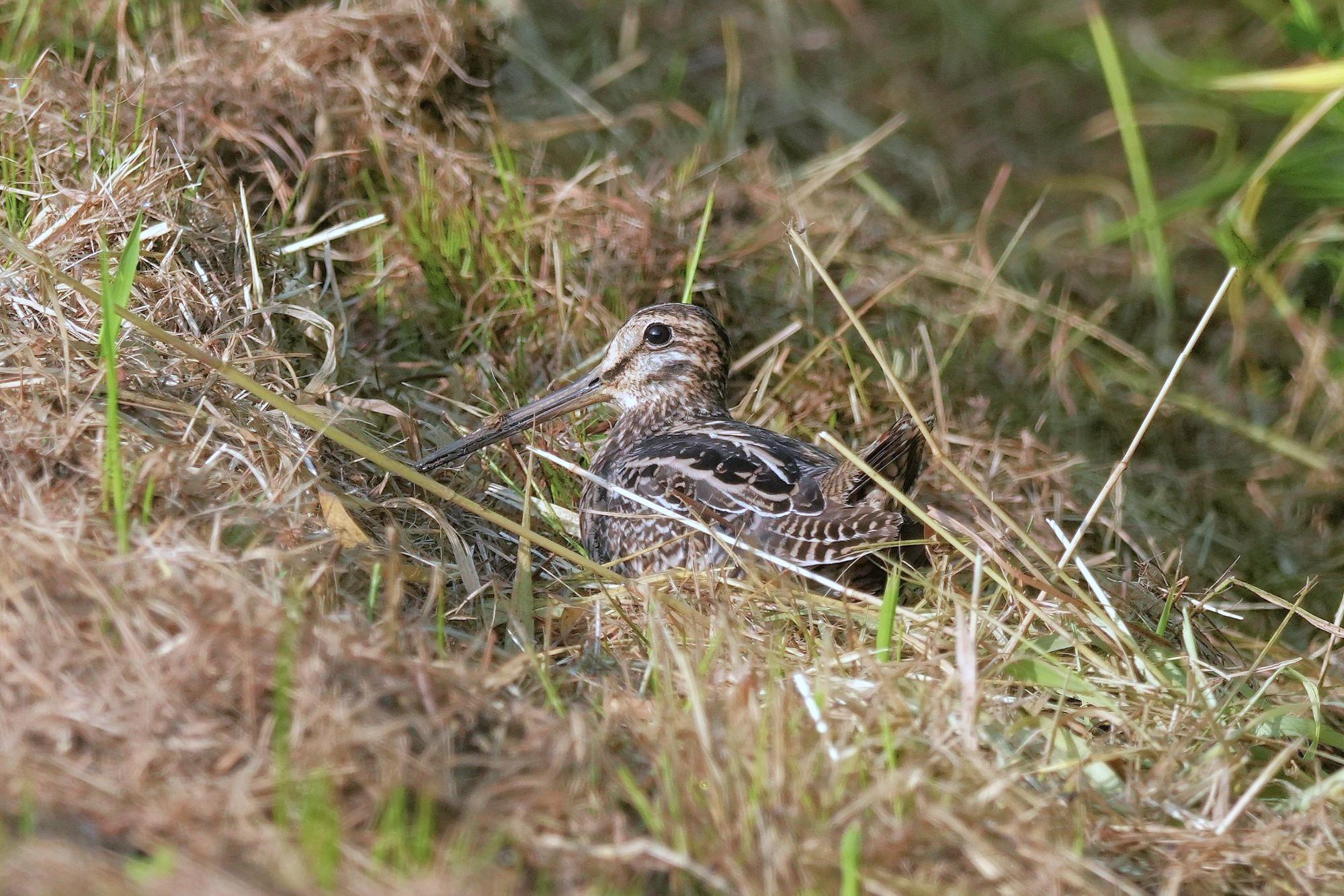 3羽ないし4羽いたうちの1羽だけ撮影できましたが、画像を確認すると一般的なタシギではないように思えました。肩羽の形状、嘴基部の太さ感、嘴基部から目までの距離感、過眼線上の白い部分の広さ感等からオオジシギかなと考えています。ただしオオジシギにしては色合いが濃いようにも思えますので幼鳥かな?とも思えます。