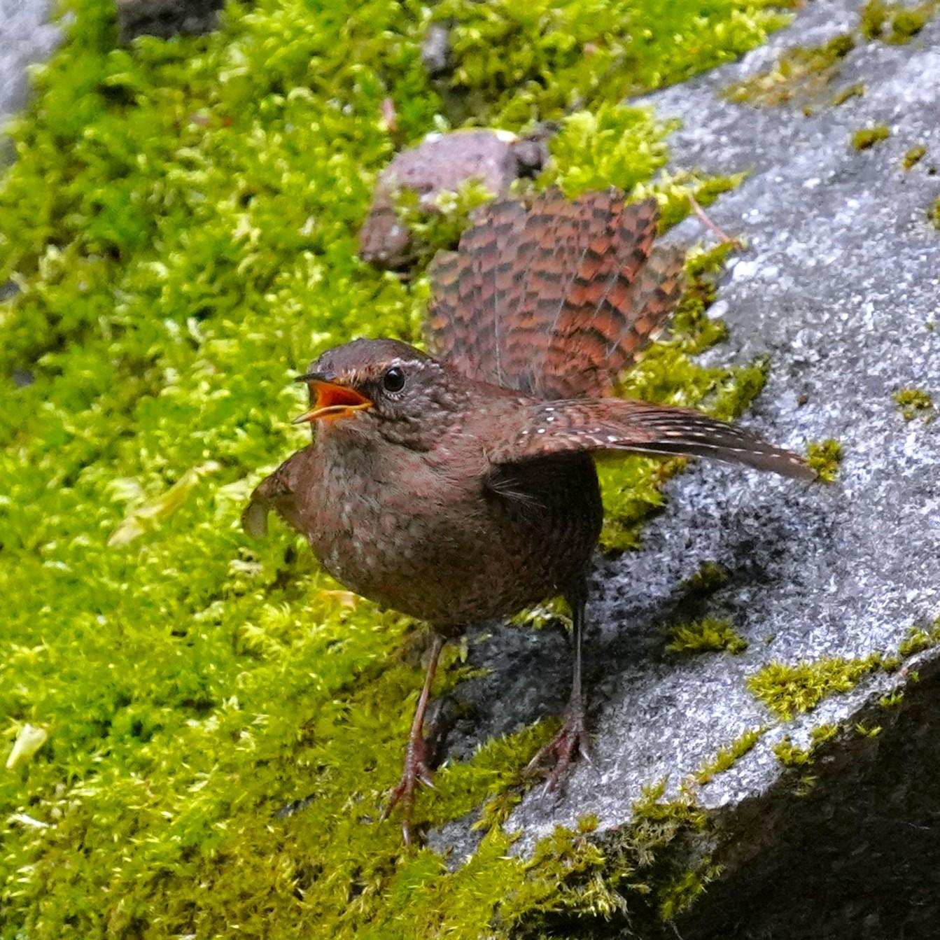 葉の色が濃くなり鳥が見難くなりましたが、久々に渓流でミソサザイに会いました。尾羽を広げ翼をバタつかせながらノリノリで元気に囀っていました。