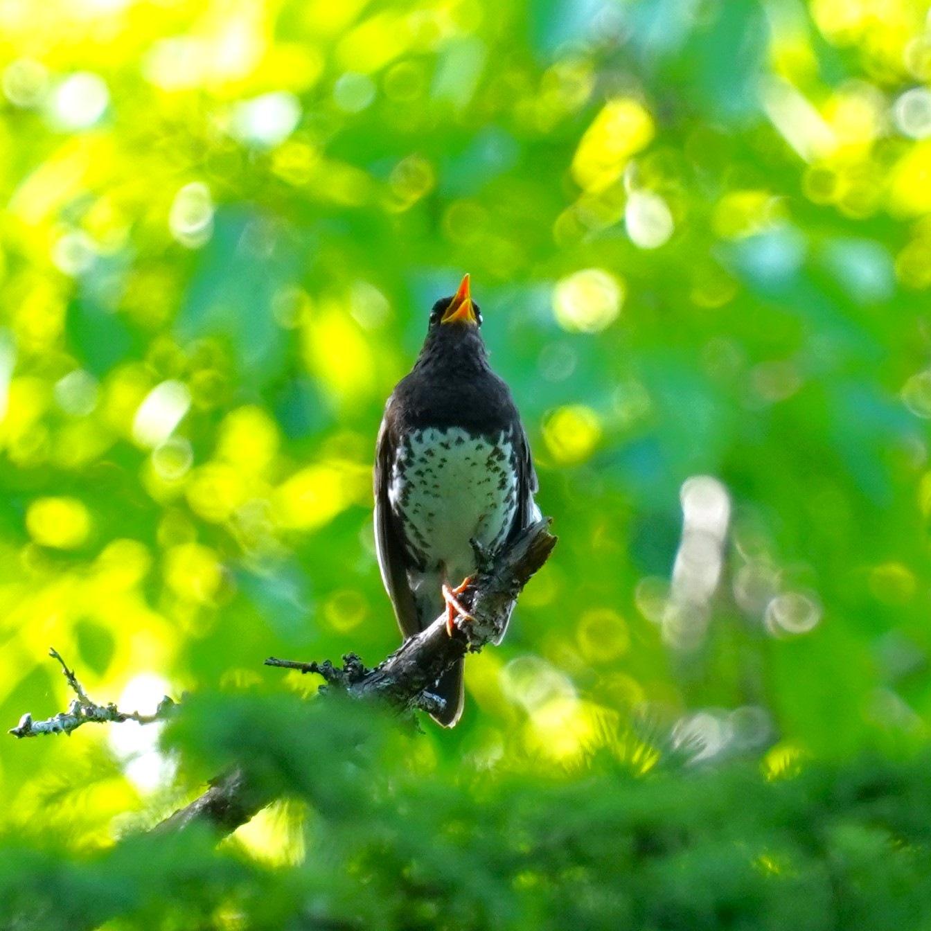 こちらは暗い森の中で囀るクロツグミです。声はすれども姿はなかなか見つかりません。