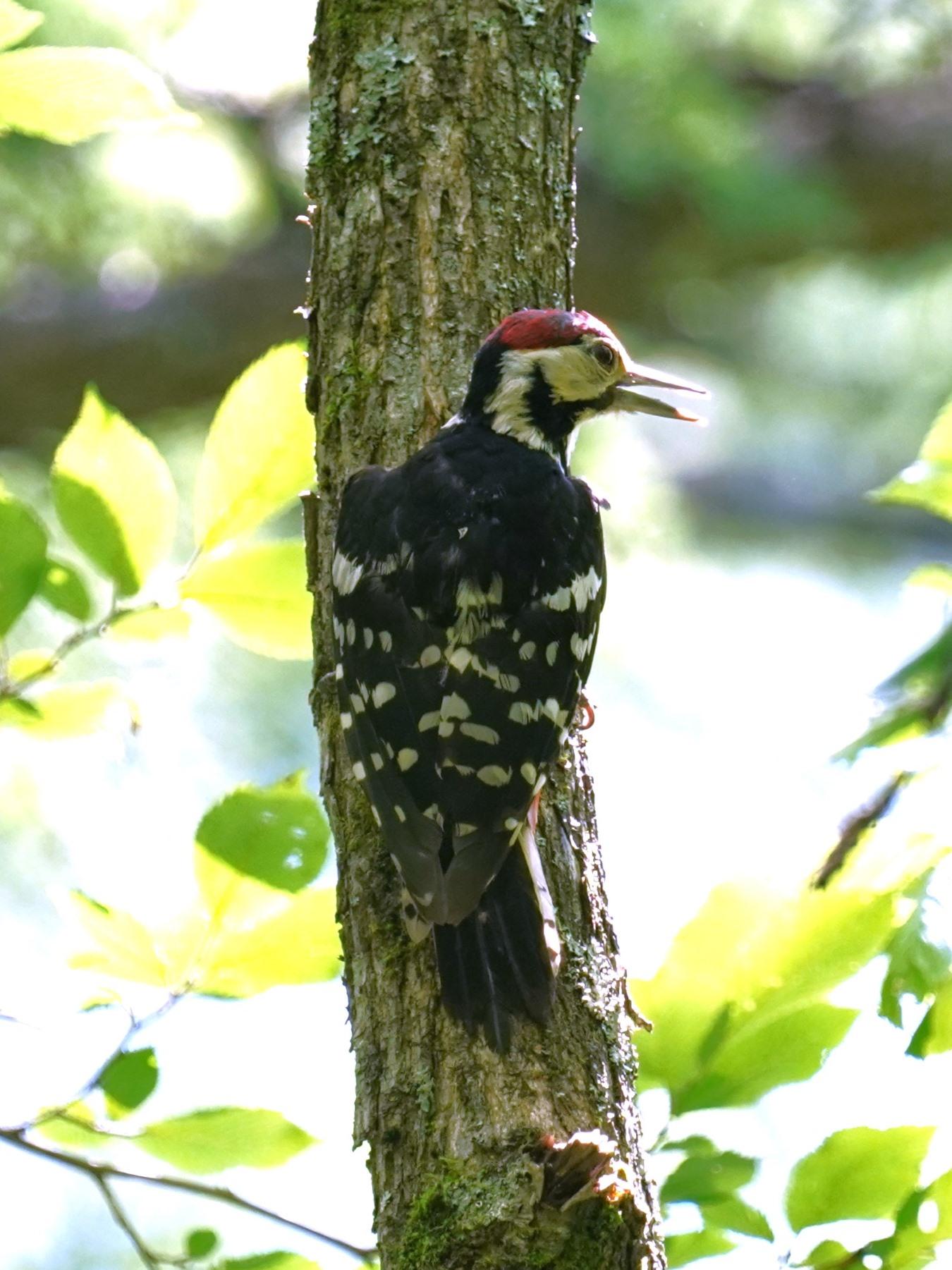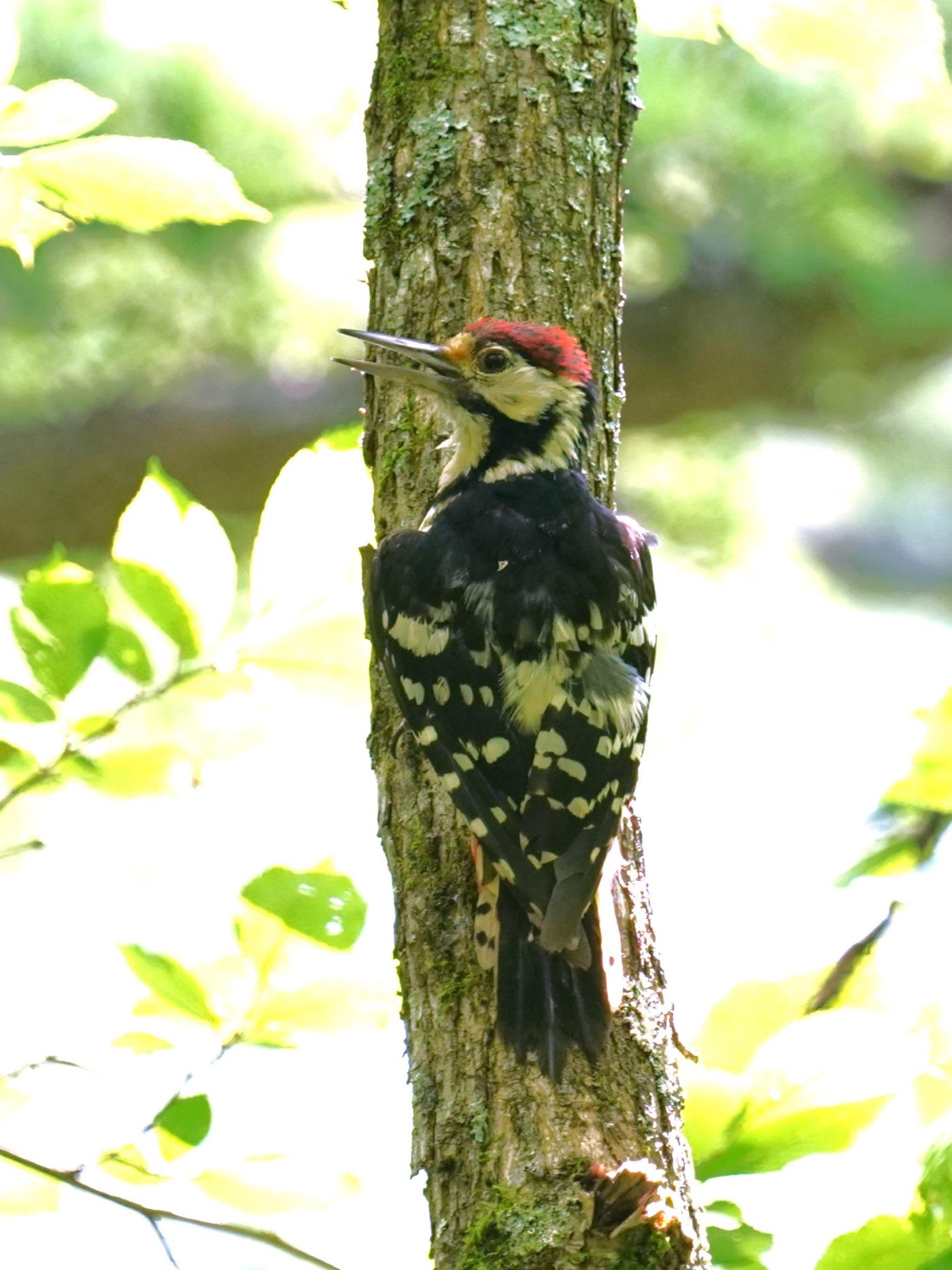 No.633kenunokaze2023年7月11日 01:45 熊の出現にドキドキしながら山奥の林業作業道を歩いていたら、キツツキの声がして前方の高い幹にとまりました。アカゲラかと思い双眼鏡で見るとちょっと様子が違うので良く確認すると、頭頂部の赤色が後頭部だけでなく全頭ベレー帽のようで、背中の大きな白斑も見られませんし腹部の斑模様もあることから、オオアカゲラの♂と判断しました。営巣育雛が終わった後なのか羽が随分と傷んでいました。