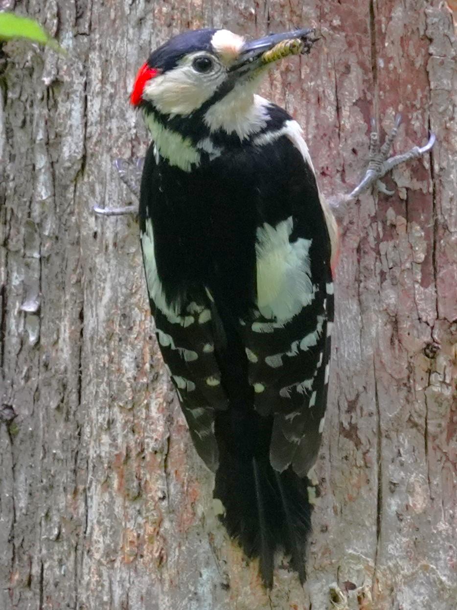 普通のアカゲラ♂、頭の赤色が後頭部のみ。