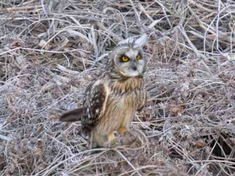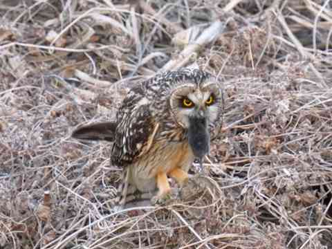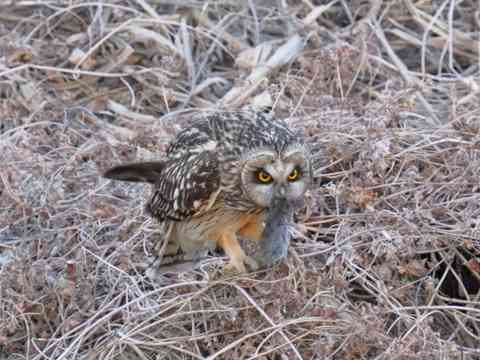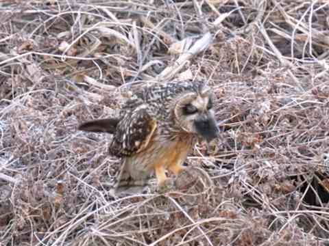 苦手な方はごめんなさい。コミミズクがネズミを捕らえ丸呑みにする食事風景を見ることができました。私はタカが餌をちぎって食べる様子からコミミも同じかと考えていました。しかし見ていると一気に丸呑みなんですね。あまり口が大きいようには見えませんが、数秒で飲み込んでしまいました。