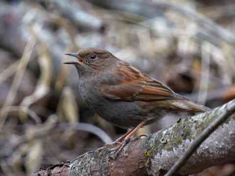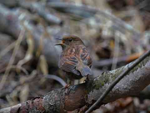 真冬の寒々しい沢沿いの林道で「チリリリリ・・」の鳴き声、声の主を探し回ること数分、地面に落ちていた枯れ枝の上で盛んに鳴くカヤクグリを見つけました。目立たない小鳥ですが近くからよく見ると地味綺麗な羽をしています。春になれば高いお山に帰るのですね。