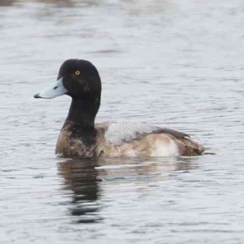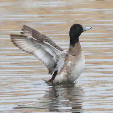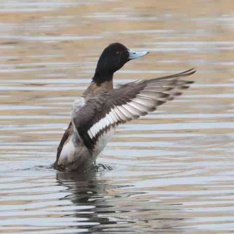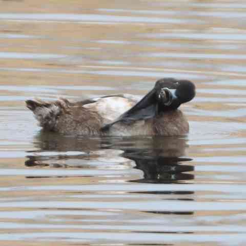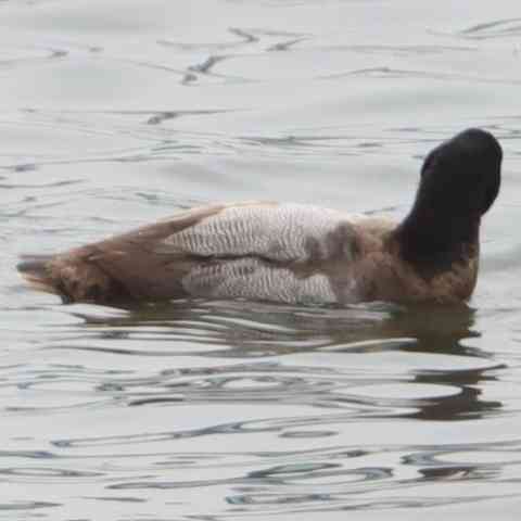 変わった色のスズガモですね。部分的に黒い色素が少なくなる、いわゆる「バフ変」といわれる個体のようです。これだけ目立てば個体識別ができて、滞在期間や近距離の移動などを追えるかもしれません。珍しい画像をありがとうございました!