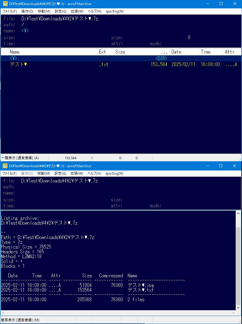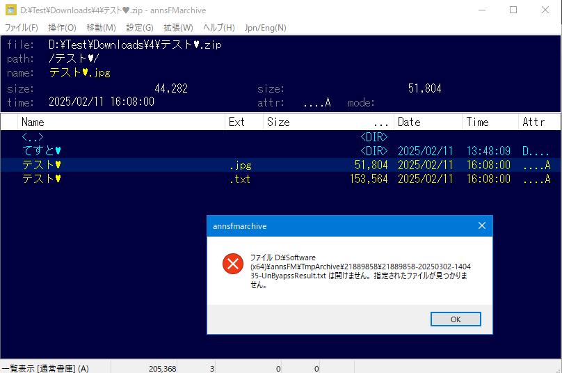 ファイル名を「テスト.zip」に変更して「annsFMarchive」で開きます。