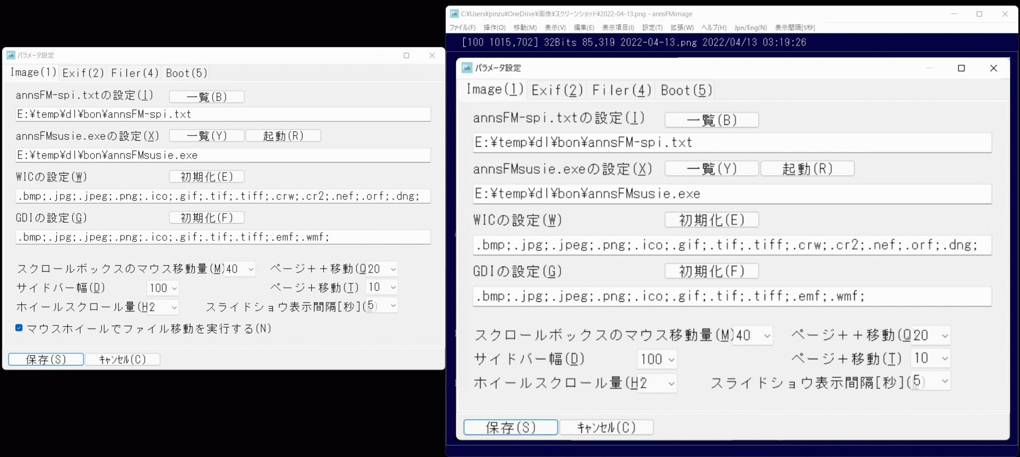 annsFMimageを起動して、画像を読みだした時に、画面上部にスケールやファイル名が表示されていると思います。ここで「パラメータ設定」の画面を表示させて下さい。