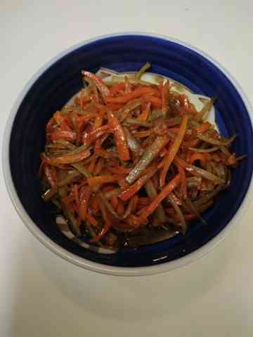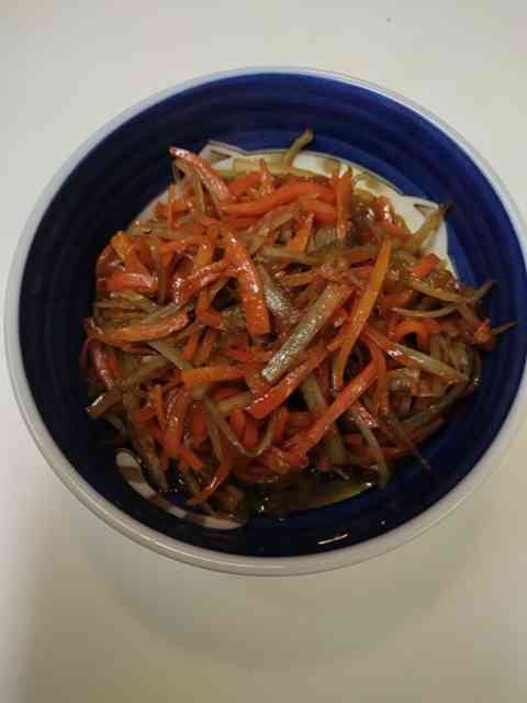 写真は久しぶりに作ったきんぴら、牛蒡より人参がだいぶ多いな