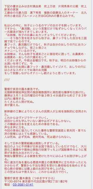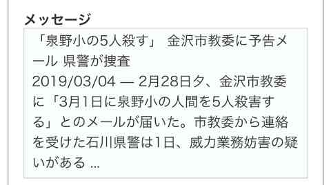 2019/03/04 — 2月28日夕、金沢市教委に「3月1日に泉野小」とのメールが届いた。市教委から連絡を受けた石川県警は1日、威力業務妨害の疑いがある ...