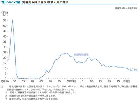 すると、昭和50年代は覚醒剤取締法違反者の検挙数が年々急増していることが分かりました。