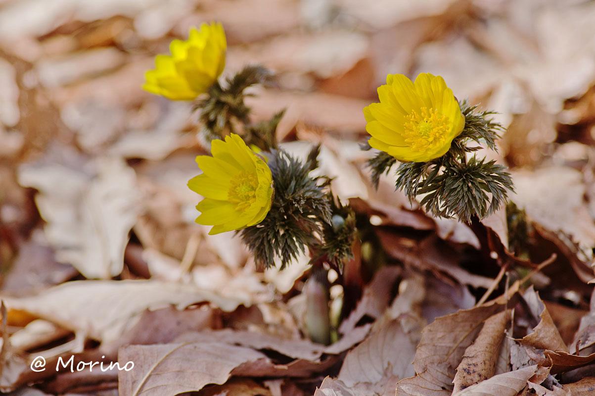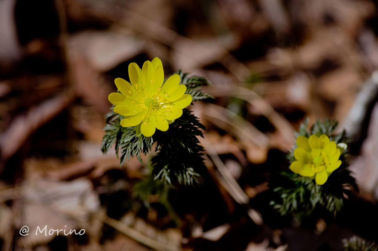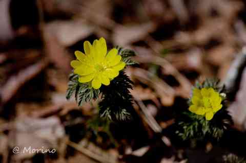 フクジュソウ2枚目、全て太陽へ向いてしまい、散策路からの撮影で正面・斜め・横といろいろ
