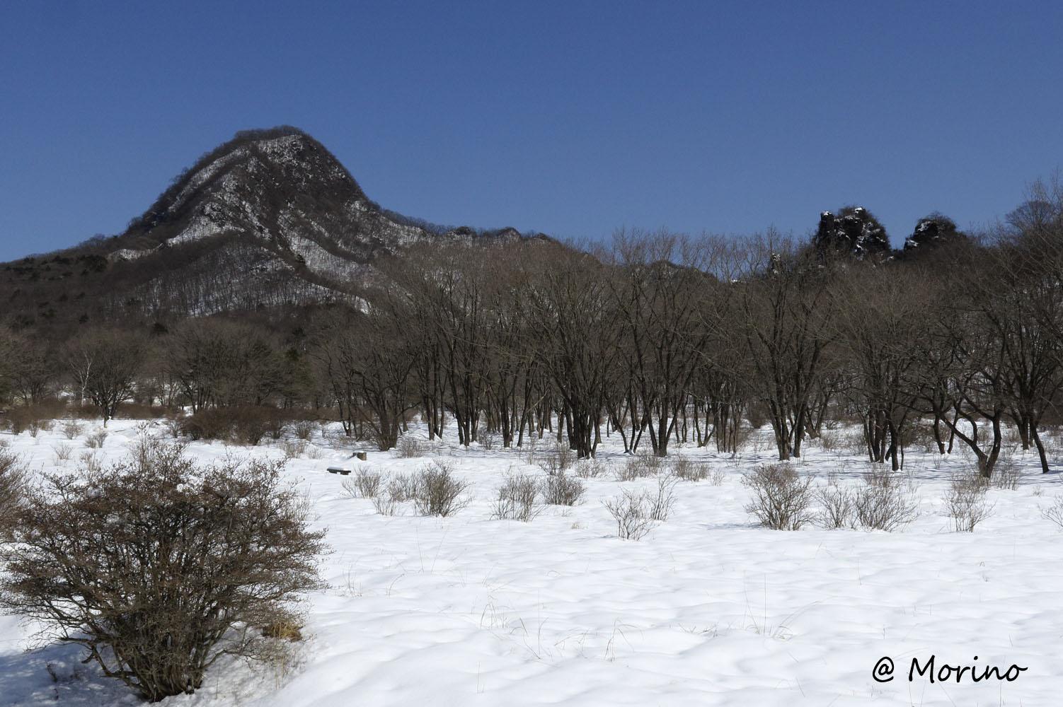 画像はヤセオネ峠から下る途中左側に見える、相馬山と磨墨岩(するすいわ)沼ノ原の雪景色