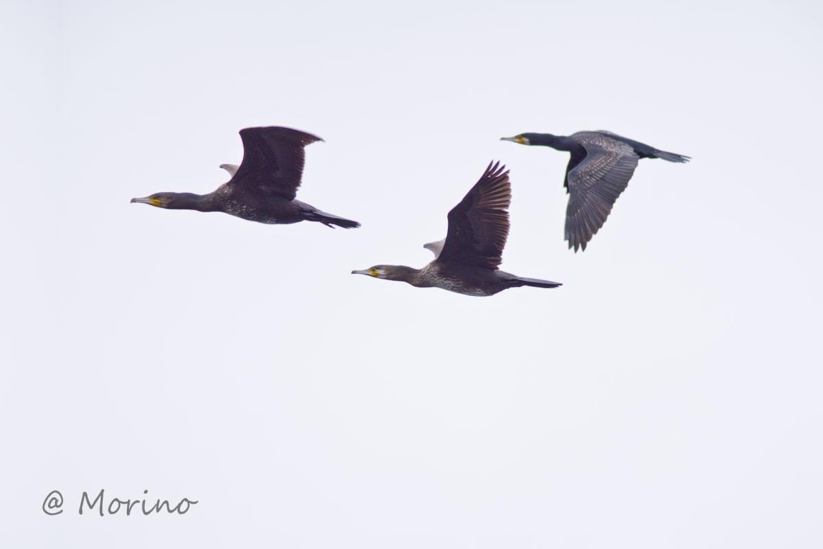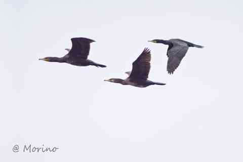 画像はカワウ飛翔、曇り空や霧で背景は白一色に