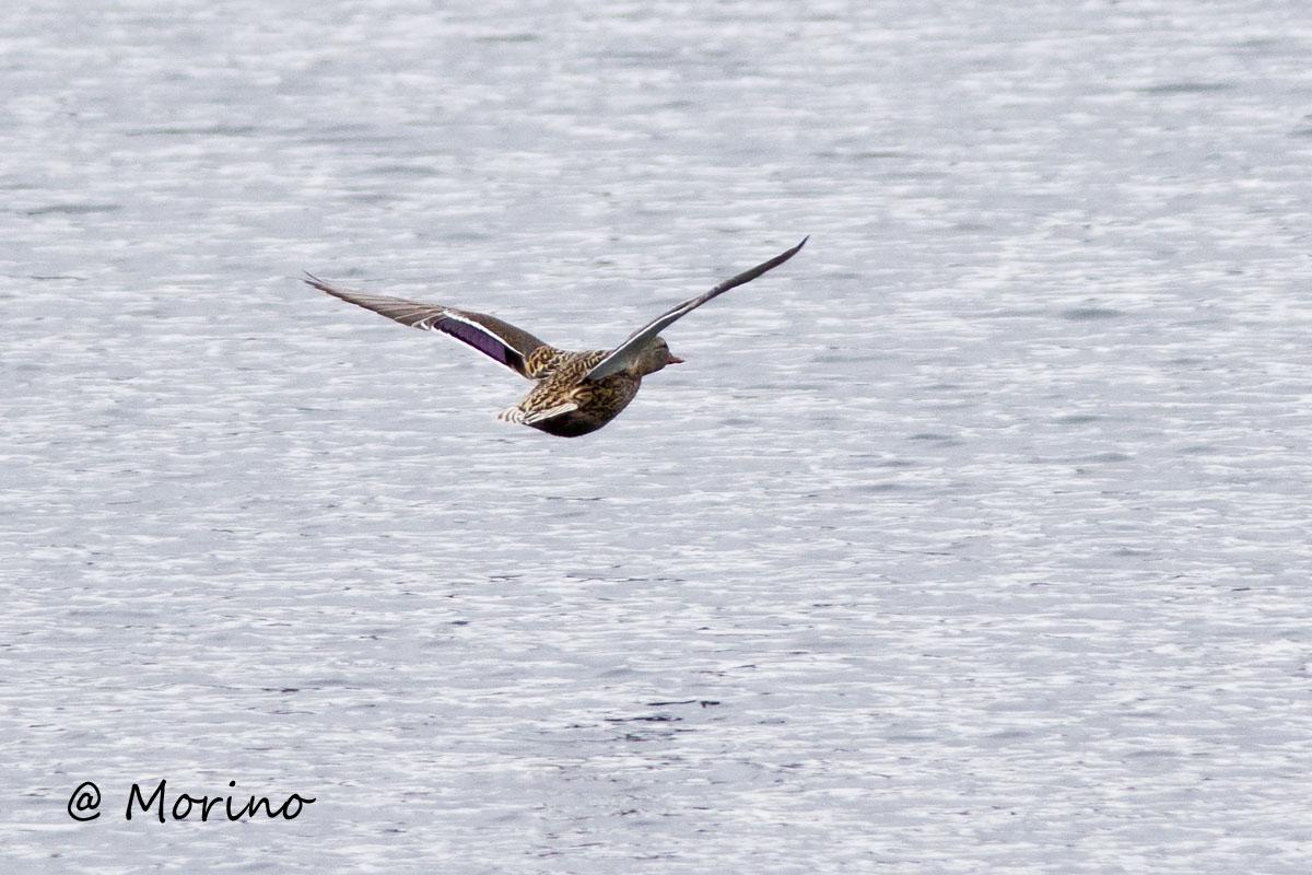キンクロハジロ、ホシハジロ、カワウが多い中で後方斜めからマガモ♀の飛翔