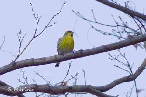 樹木の高い位置で囀っていたマヒワ、その周辺には4~5羽も枝被りが多々
