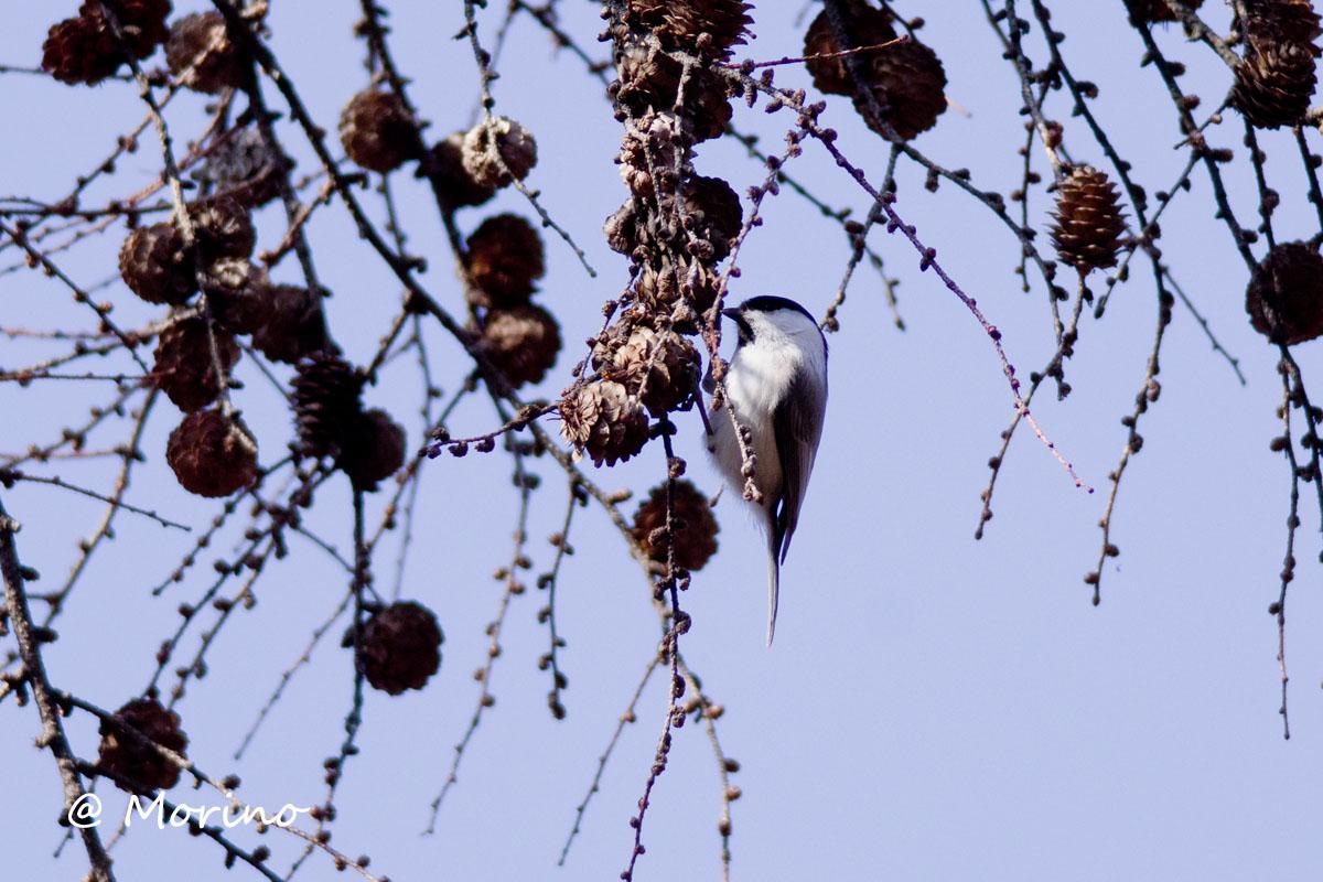 コガラもぶら下がりながら餌さがしに夢中、このスタイル影になってアイキャッチが難しい