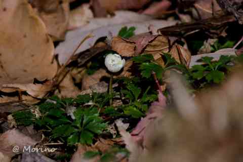キンポウゲ科バイカオウレンの蕾が一寸開き始め、散策路から離れて10ミリ弱の大きさ、野鳥撮影のBORGだけ最短距離が長く