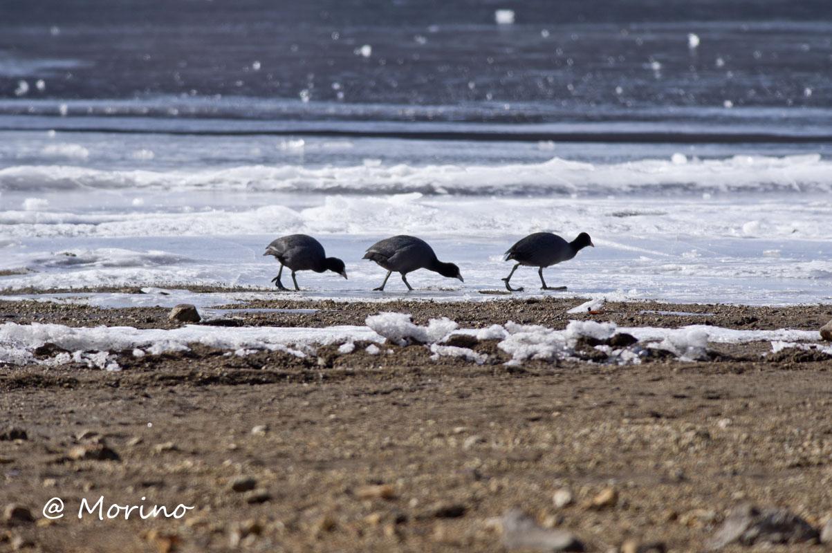 の氷上で先日事後が有ったとか、先週に比べ水面も少なく氷も厚くなった感じでした。水鳥は更に小さくなった水面で・・・