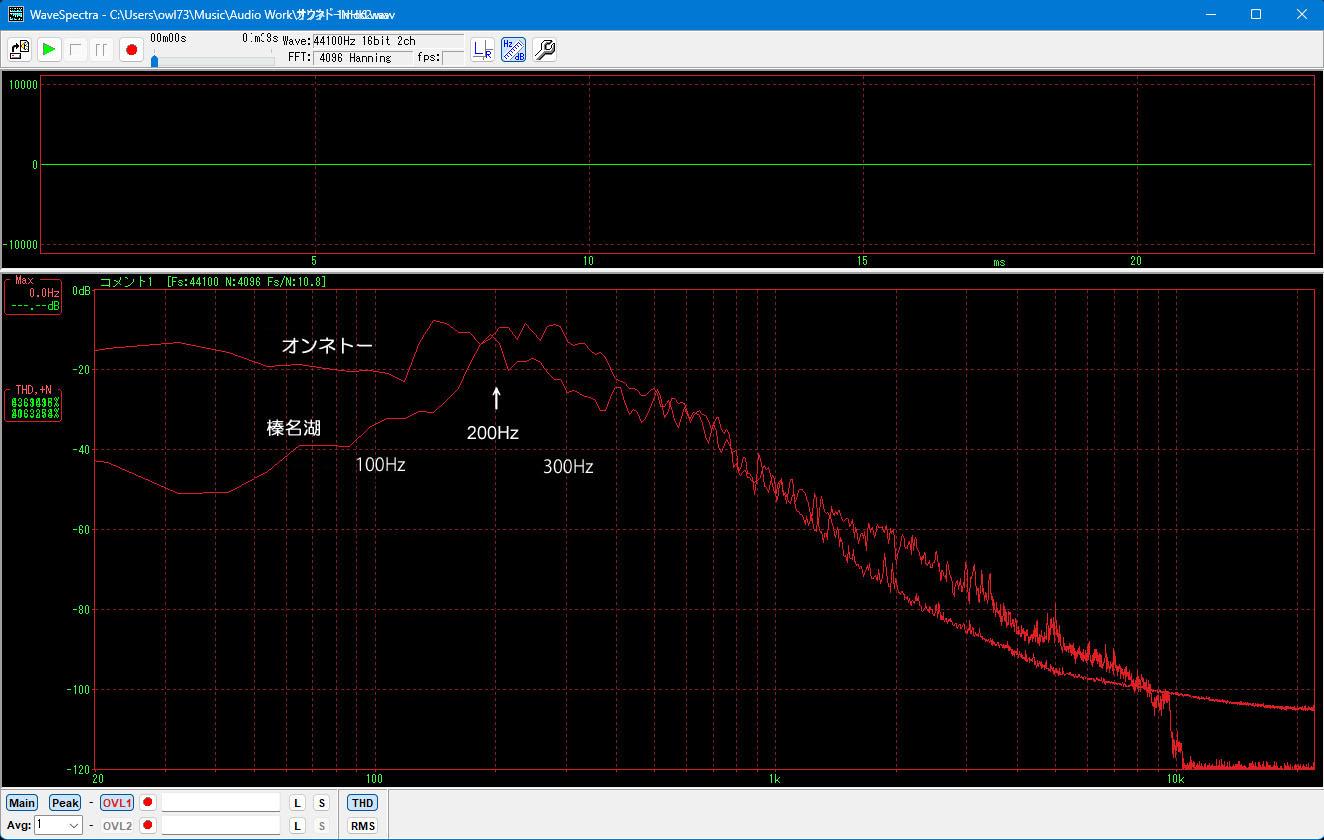 してみました。どちらも200Hz付近にピークが有り、榛名湖はノイズ軽減でフイルター処理、オンネトーは緩やかなピークで、