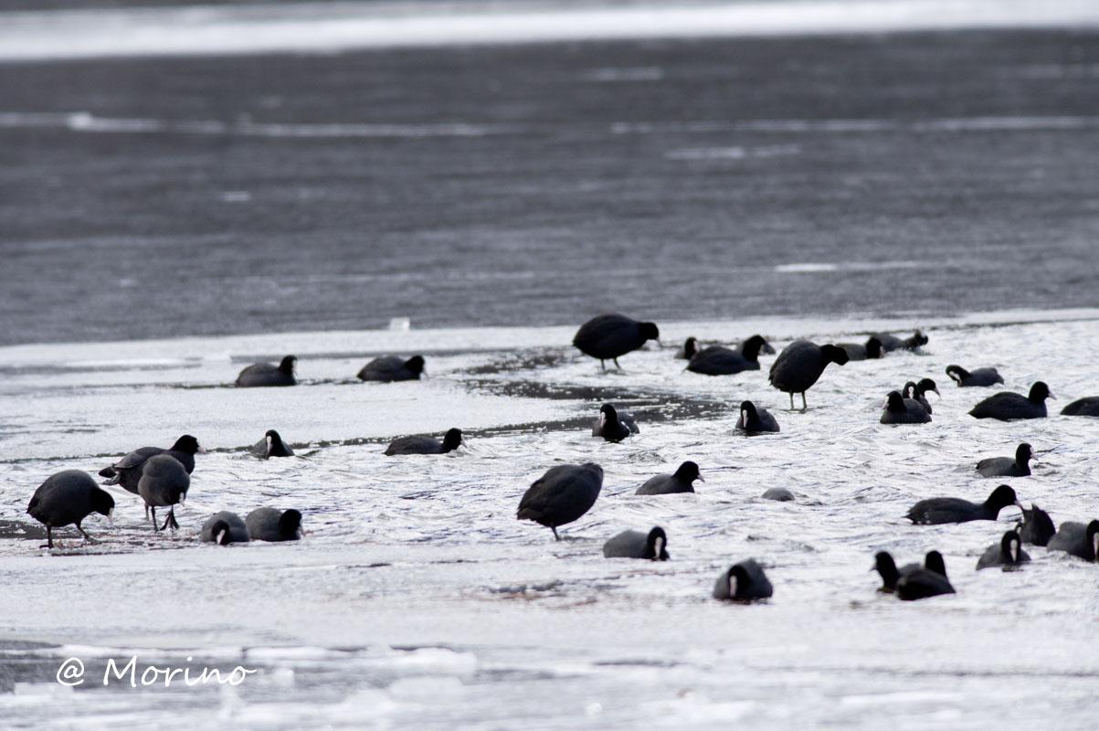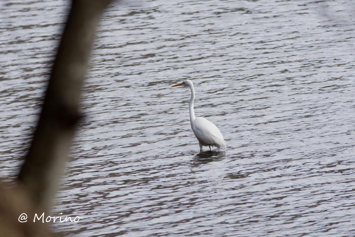 少なくなった水面の東側ではオオバンが沢山、西側には先週遠くてコサギと思ったダイサギがアオサギと