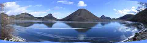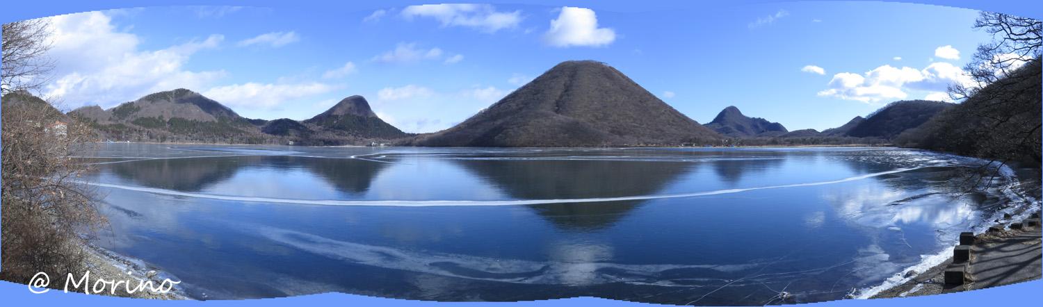 寒さが続き90%位の結氷で水面と間違えそう、コンデジで西側から撮った4枚をパノラマ(Adobe CS5 Photo merge)縮小のみ