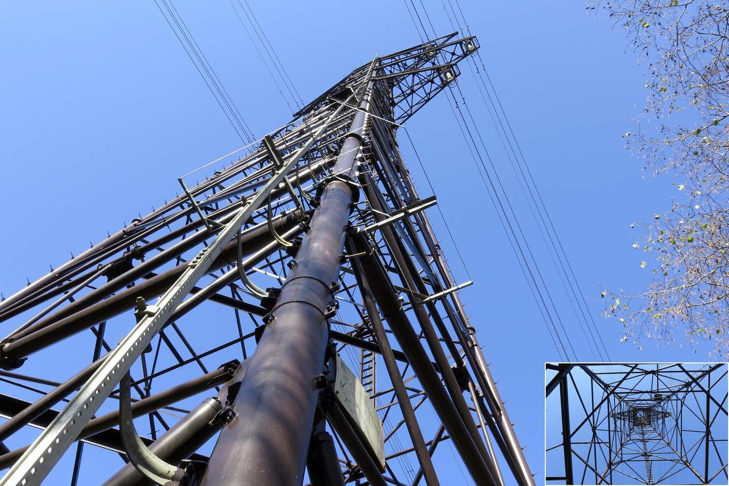 立入禁止の柵が無く真下は登山道、鉄塔真下の真ん中と側面から撮影