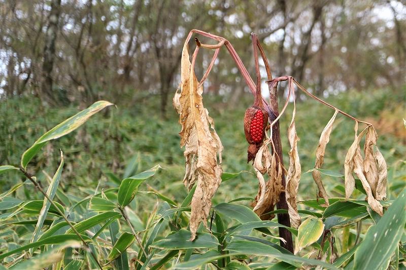 びっしりとついた果実の重みで折れたテンナンショウに秋の深まりを感じます。