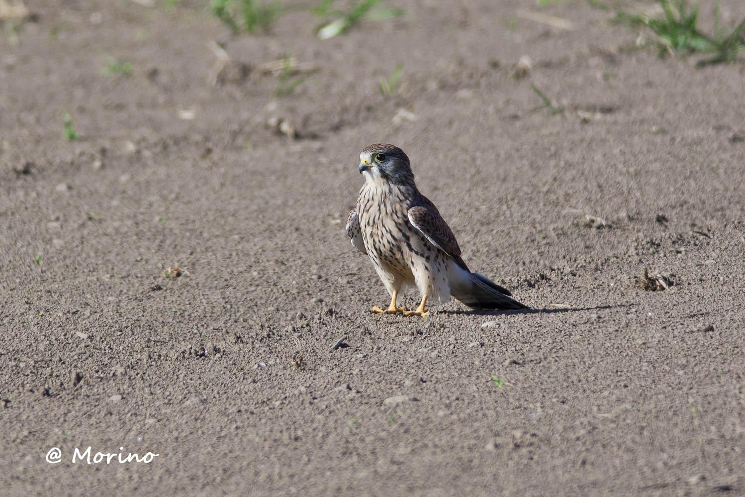 チョウゲンボウが珍しく乾燥した畑地へ降り、獲物でも捕らえるのかと思ったら砂浴びの行動