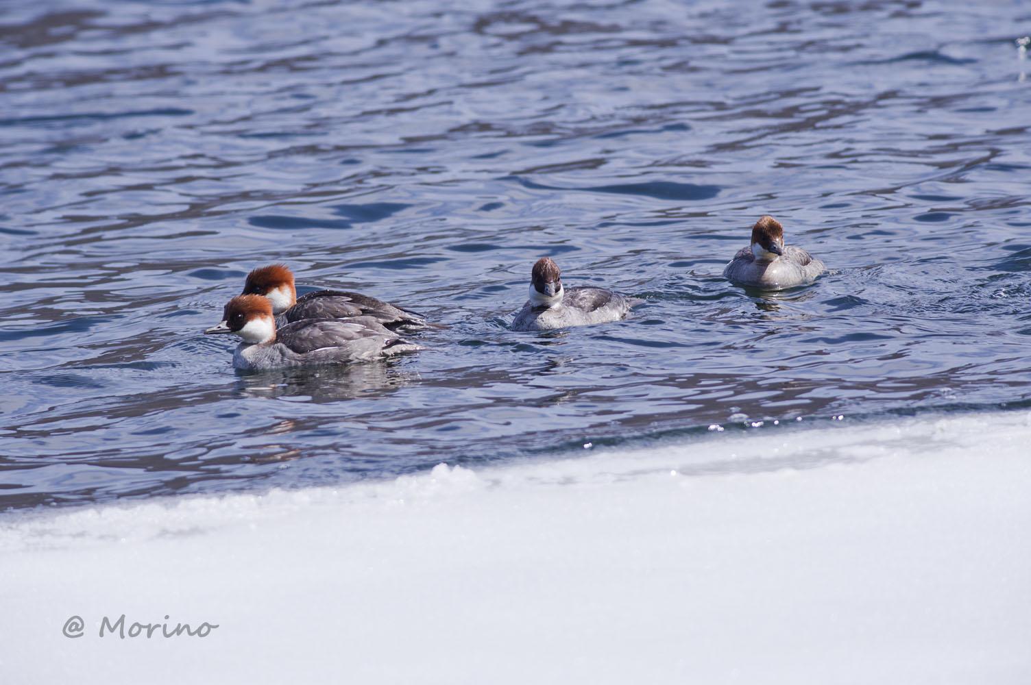 ミコアイサ(♂4、♀7)、それにカワウが時々、一部の水面なので他に未確認の種が居るかも知れません。