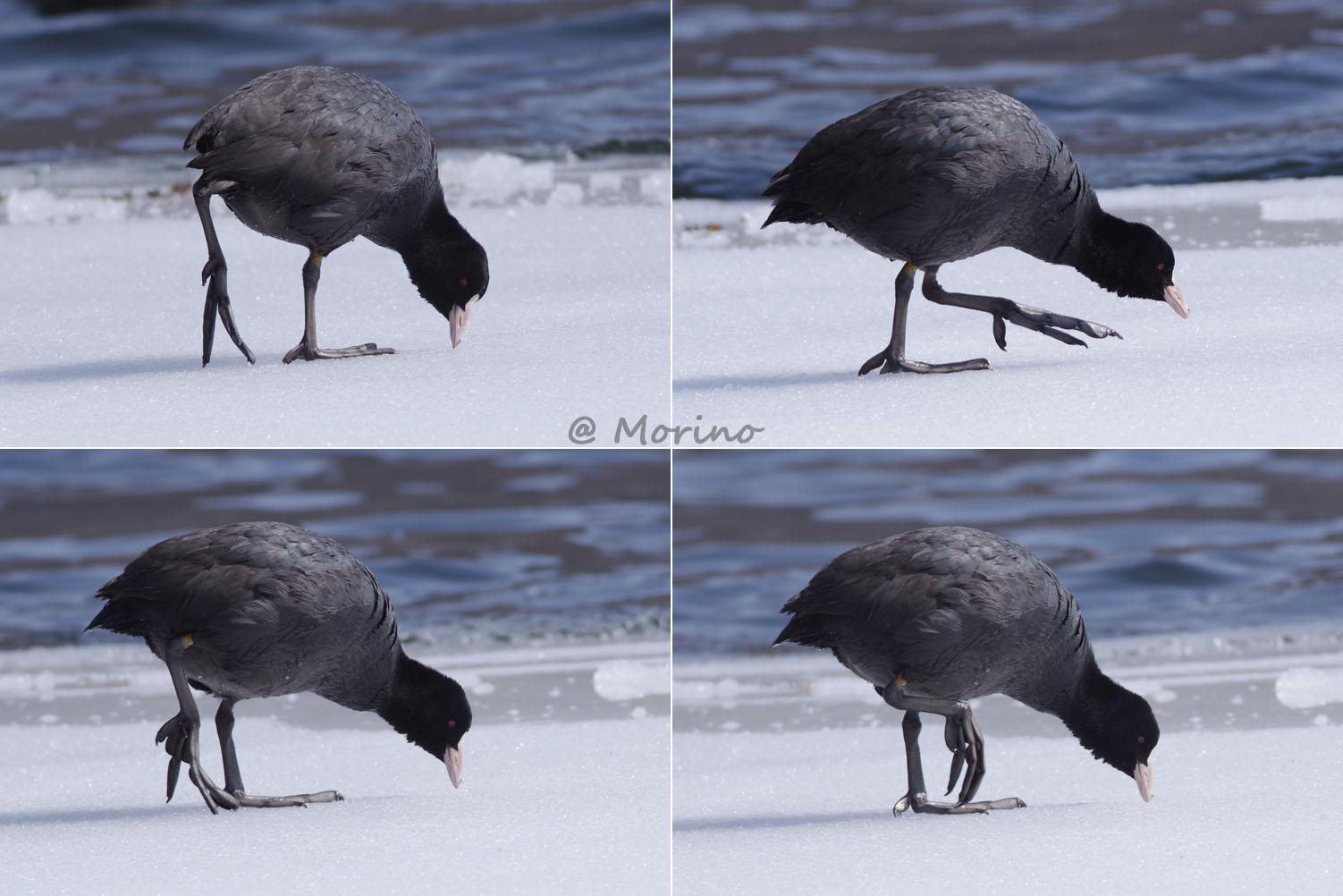 オオバンが結氷した上に上がり何やら餌探し、大きな足が印象的。