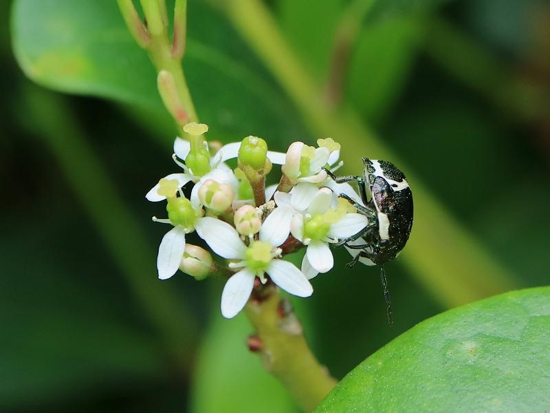 ツルシキミとアカスジキンカメムシ これはキンカメの幼虫だろうか 白黒模様 成虫だったらとてもきれいなはずですね。