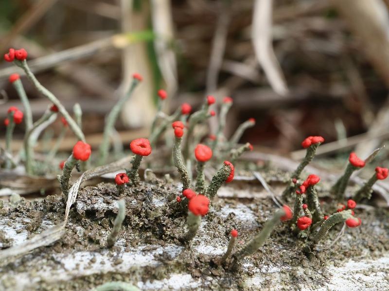 コアカミゴケ 小さいですが真っ赤なのですぐに目に入りました コケとありますが地衣類のようです。