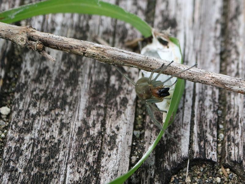 家に帰って調べてみるとカバキコマチグモであることがわかりました何と 日本の在来種の中で最も強い毒性を持っている 世界猛毒生物の6番目にランキングされているとあります 写真でもわかりますが黒い大きな牙が見えます 身近にも怖い生物がいるのですね 気をつけなければとつくづく思いました。