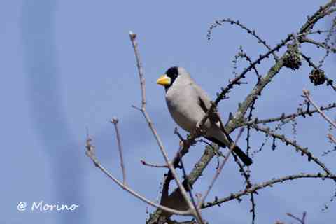 帰途伊香保森林公園つつじヶ丘近くでイカル小群がカラマツに、殆ど枝被りの中で1羽だけ枝被り無し