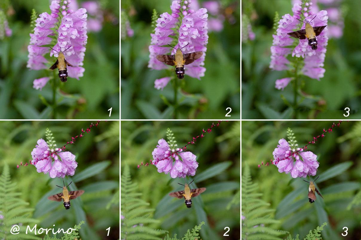 ホシホウジャクの羽(翅)がSS1/1000では完全にぶれた写り、模様が分かる静止した画像と