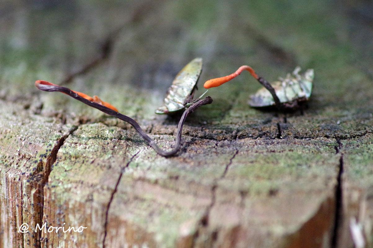 キノコ部分から寄生していたカメムシまでの様子、点在していた2点を木製杭の上に載せ撮影